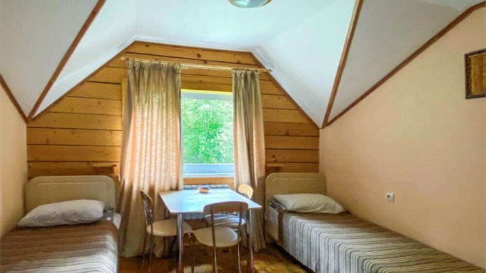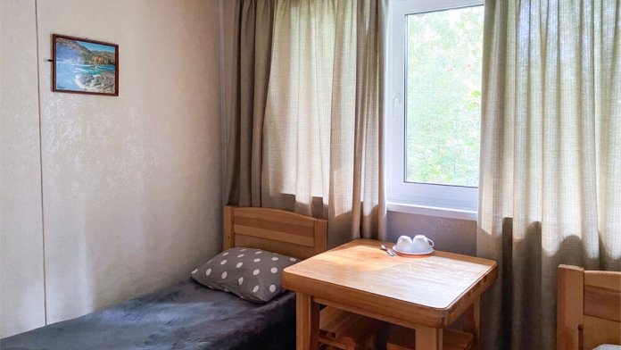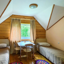 Двухэтажный дом из дерева. 2 этаж, комната с балконом - вид на гору: две односпальные кровати, диван, комплект полотенец. Стол, стулья, гардеробная зона. Кухонная зона на 3 номера (кухонный шкафчик, раковина, эл. чайник, мини-холодильник), санузел на 3 номера (душ, унитаз, раковина, зеркало, водонагреватель, г/х вода, туалетные средства).