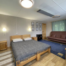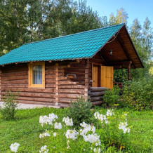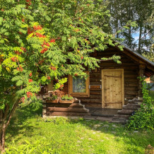 Рубленный дом из сосны, отдельно стоящий. Двуспальная кровать, односпальная кровать. Обеденная зона, холодильник, чайник, набор посуды, гардероб. Душ, туалет, г/х вода, фен.