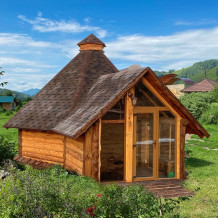 Отдельно стоящий дом. Шестиугольная комната, компактная печка-камин, небольшая веранда.