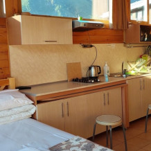 В номере «Студия» есть кухонная зона, санузел и душевая кабина, теплый пол.