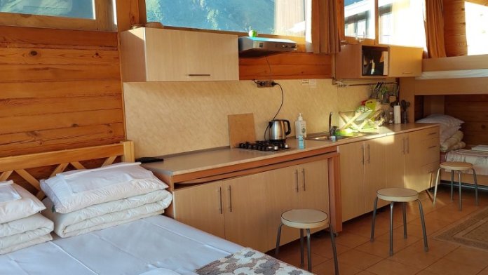 Однокомнатный номер для четырех человек с одной двуспальной кроватью и одной двухъярусной.