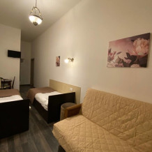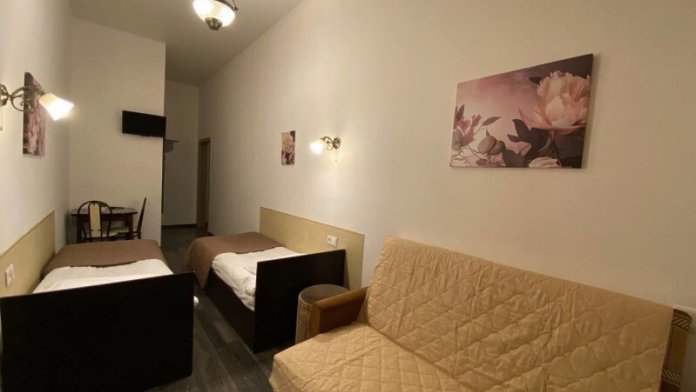 В номере 2 односпальные кровати и двуспальный раскладной диван.