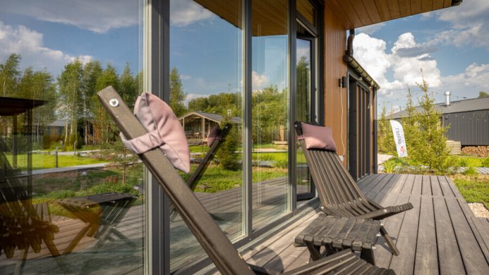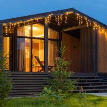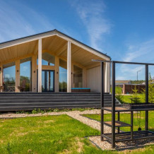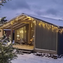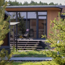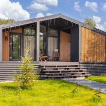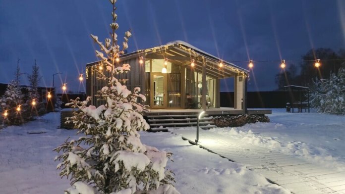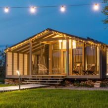 Высокие потолки, окна в пол и приподнятый, для панорамного вида, фундамент - все это позволит вам получить незабываемое ощущение объема и пространства. Это ощущение усилит самая большая сауна со стеклянной стеной и видом на подсвечиваемую купель.