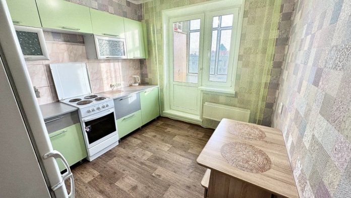 Кухня: обеденный стол, стулья, кухонный гарнитур, электроплита, холодильник, микроволновая печь, стиральная машина, электрочайник, посуда и кухонные принадлежности.