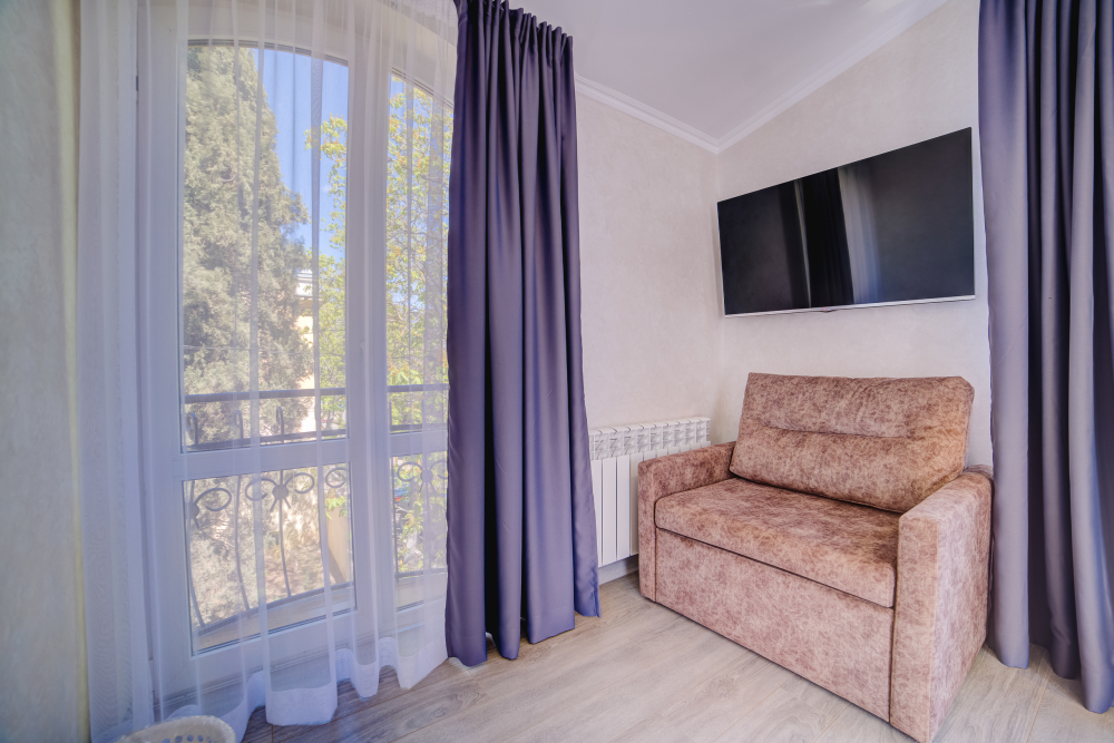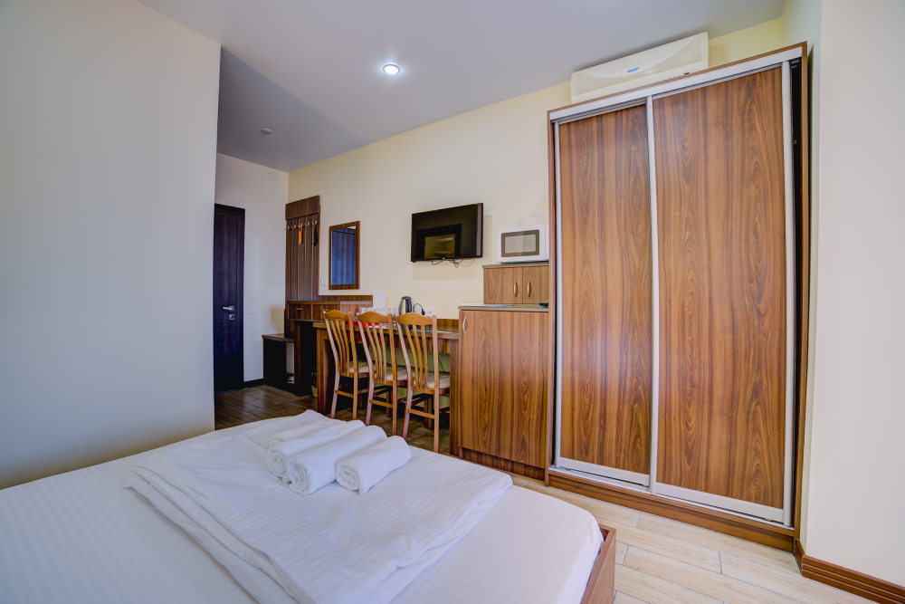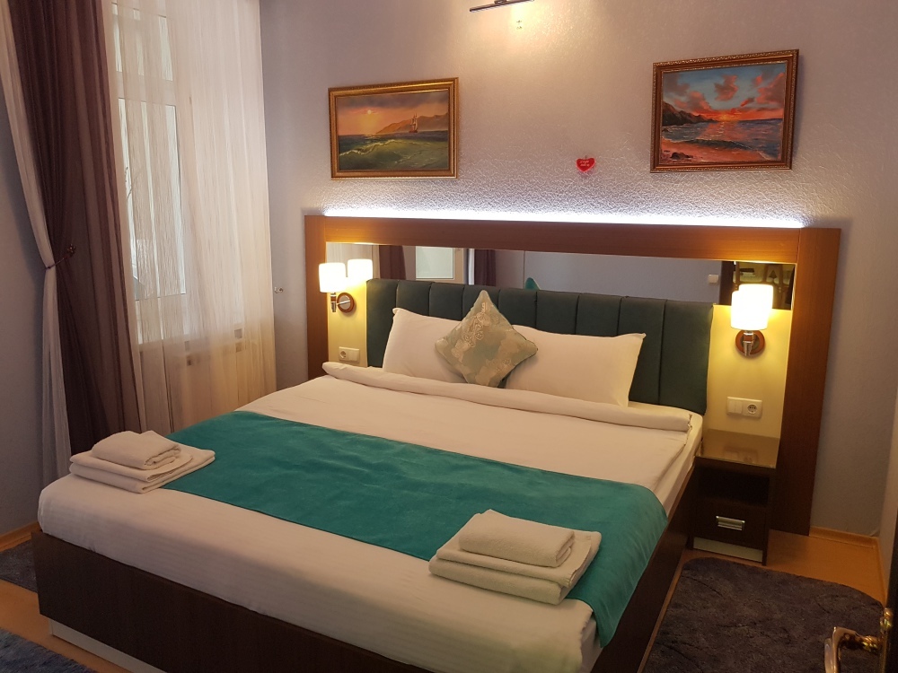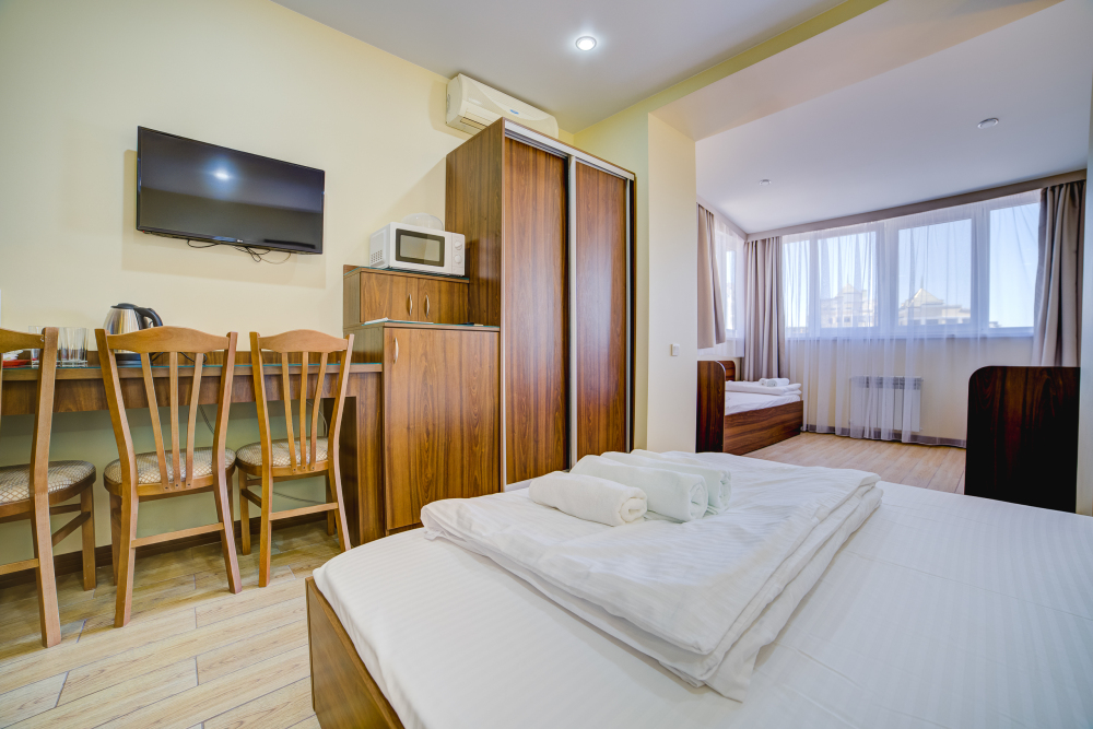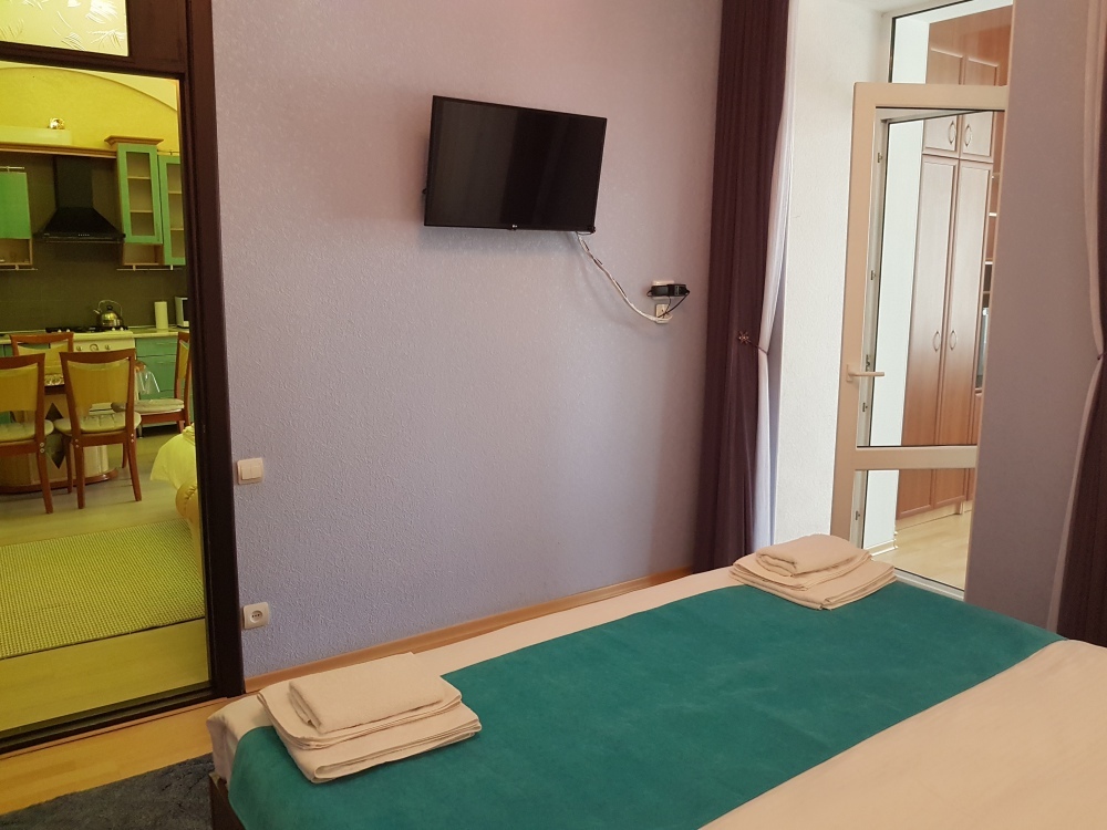 Площадь комнаты - 14 кв м, диван-кровать, телевизор, холодильник, микроволновая печь, набор посуды, тапочки, туалетные средства, банные полотенца, кондиционер, сейф, автономное отопление (зимой), санузел с душевой кабинкой, фен, французский балкон (вид на город), WI-FI. Уборка – ежедневно, смена постельного белья – раз в три дня.