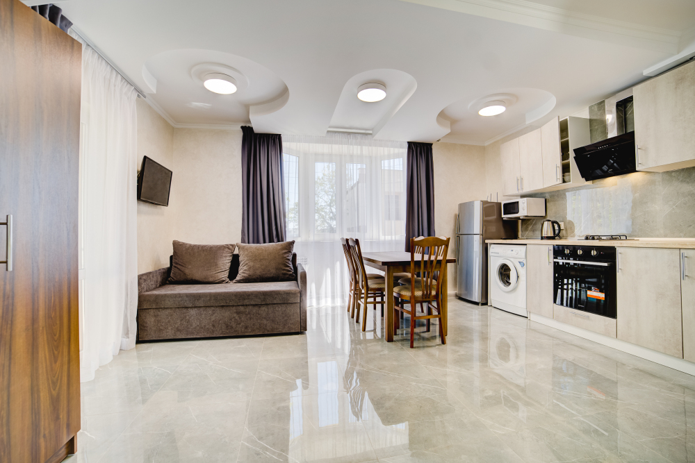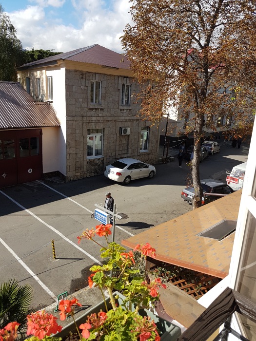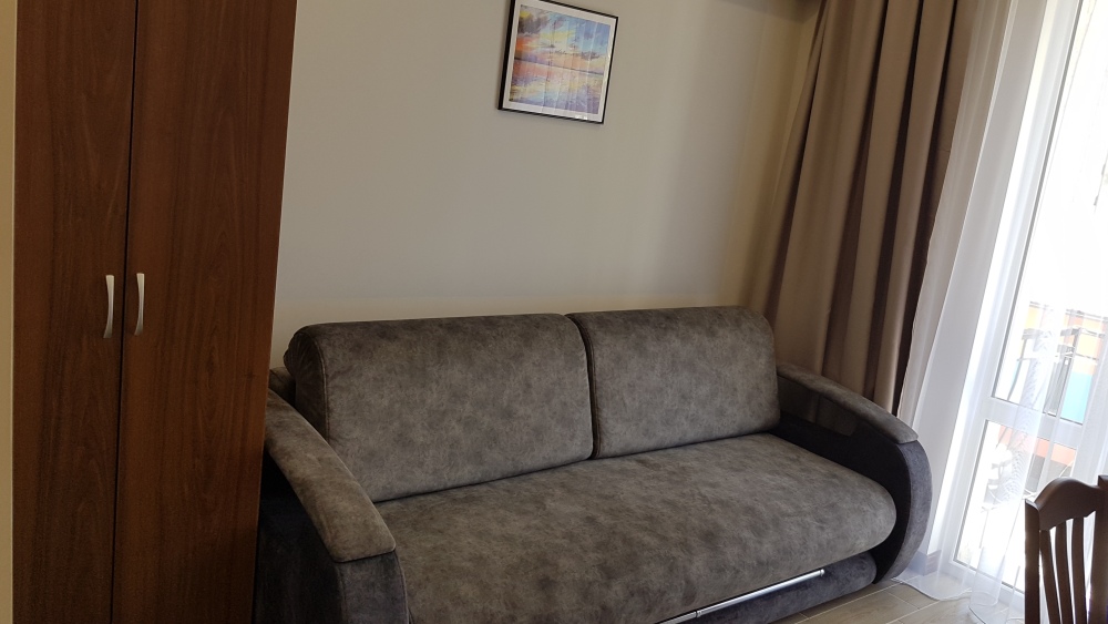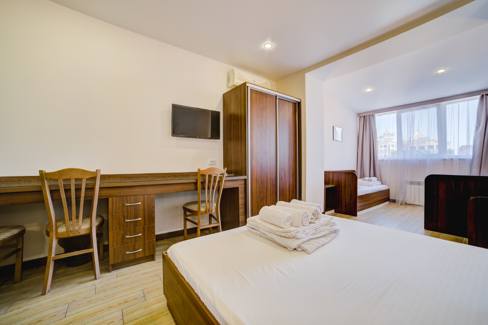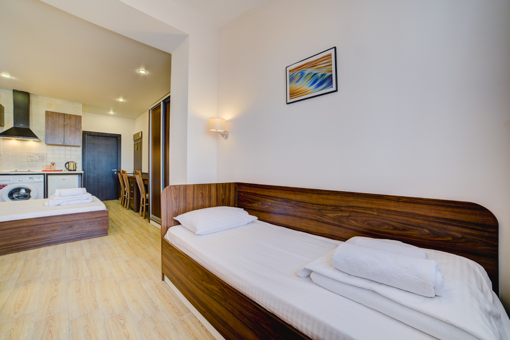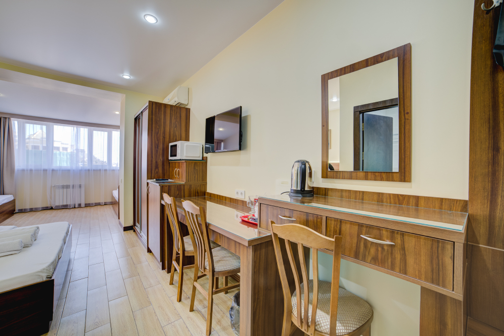 Площадь комнаты - 14 кв м, диван-кровать, телевизор, холодильник, микроволновая печь, набор посуды, тапочки, туалетные средства, банные полотенца, кондиционер, сейф, автономное отопление (зимой), санузел с душевой кабинкой, фен, французский балкон (вид на город), WI-FI. Уборка – ежедневно, смена постельного белья – раз в три дня.