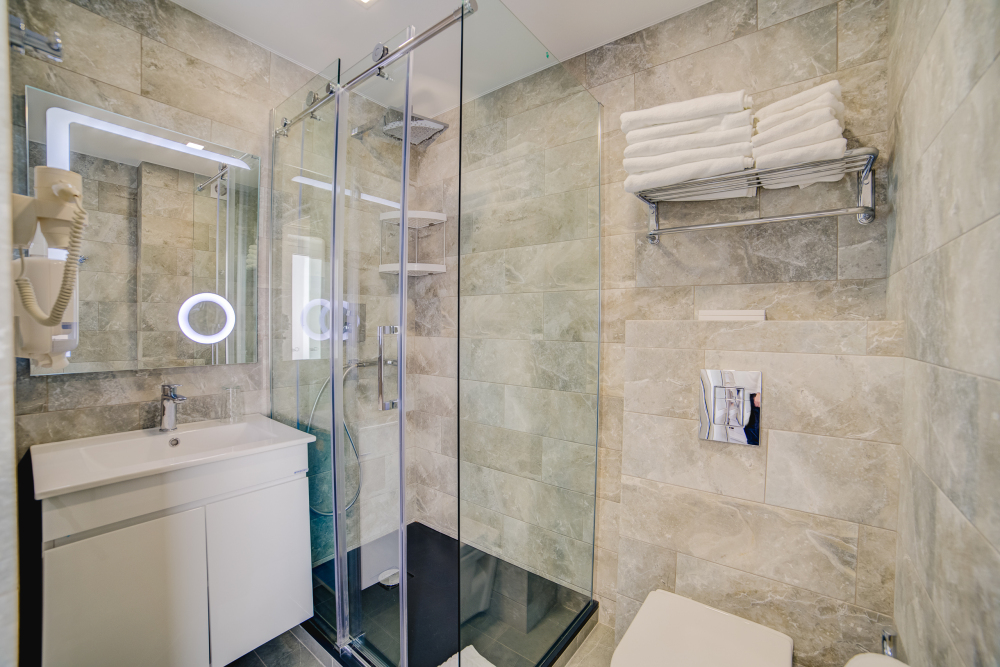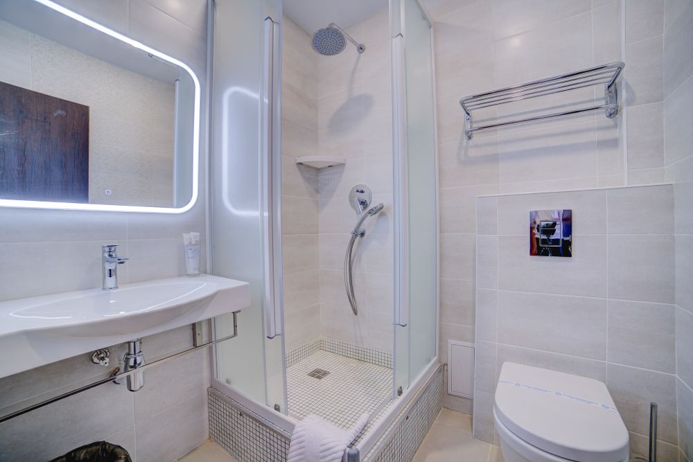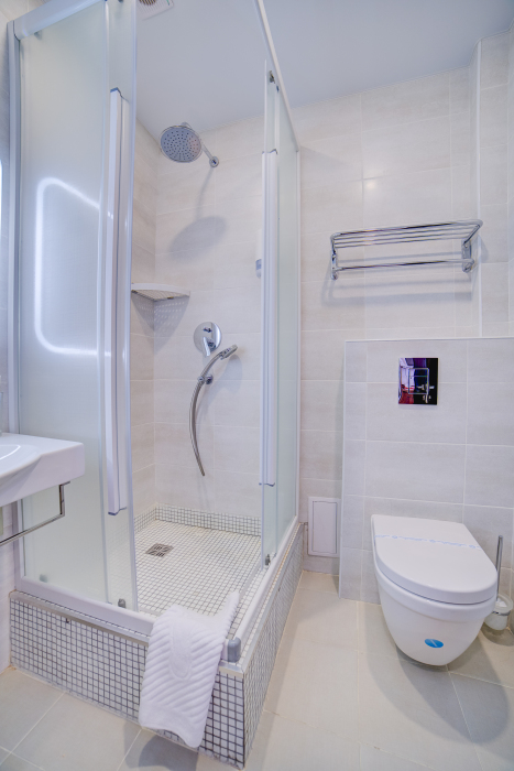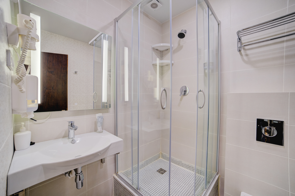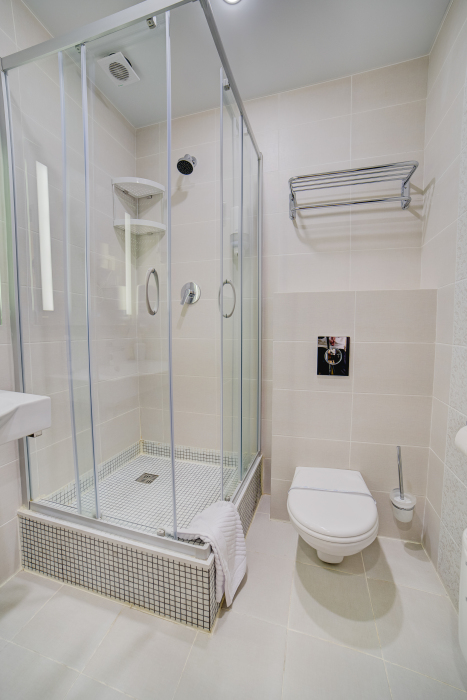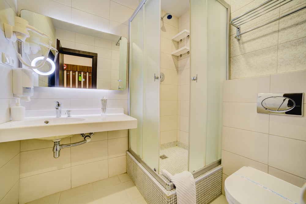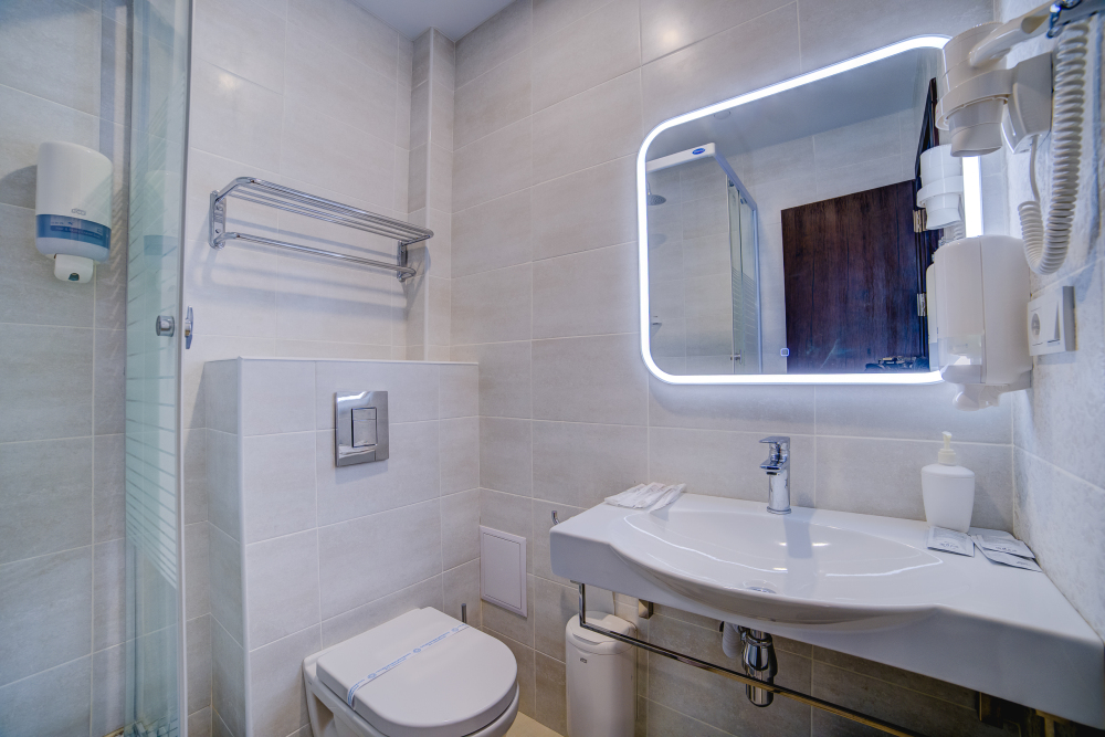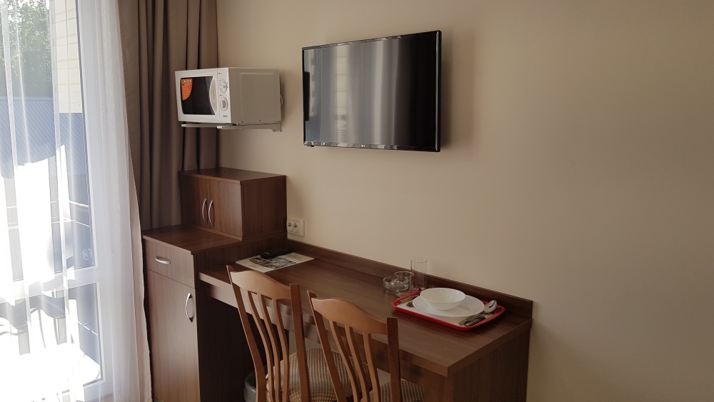 В номерах – холодильники, кондиционеры, телевизоры. Санузлы оборудованы унитазом, душевой кабинкой, умывальником с круглосуточной подачей горячей и холодной воды. Есть общая кухня с микроволновой печью на этаже. Электрочайник, фен, утюг, гладильная доска выдаются по требованию гостей.