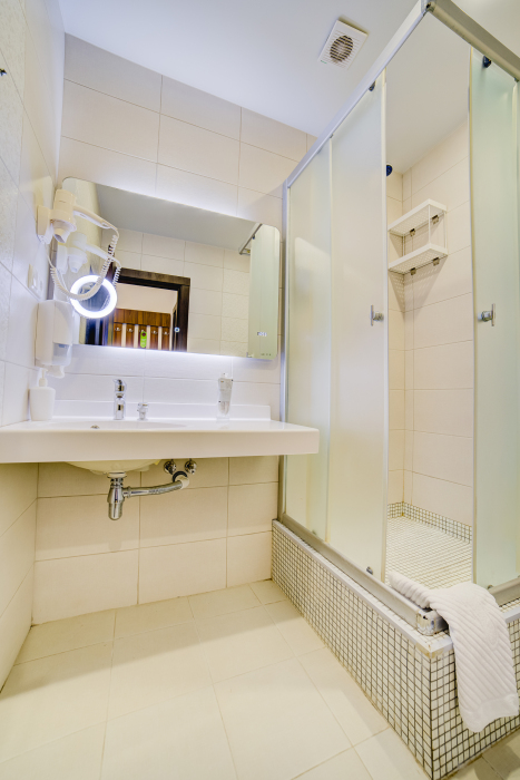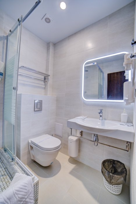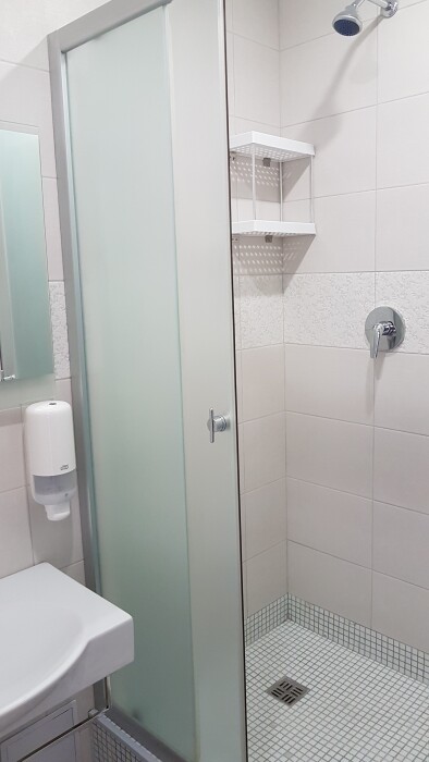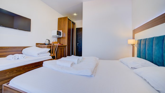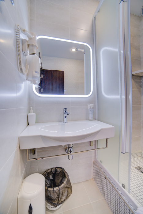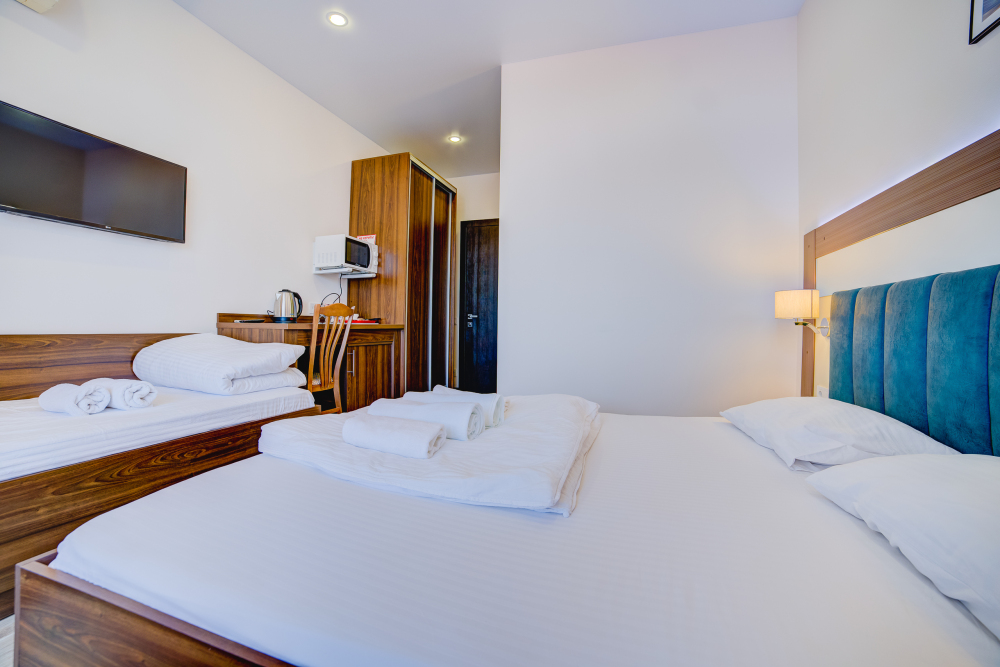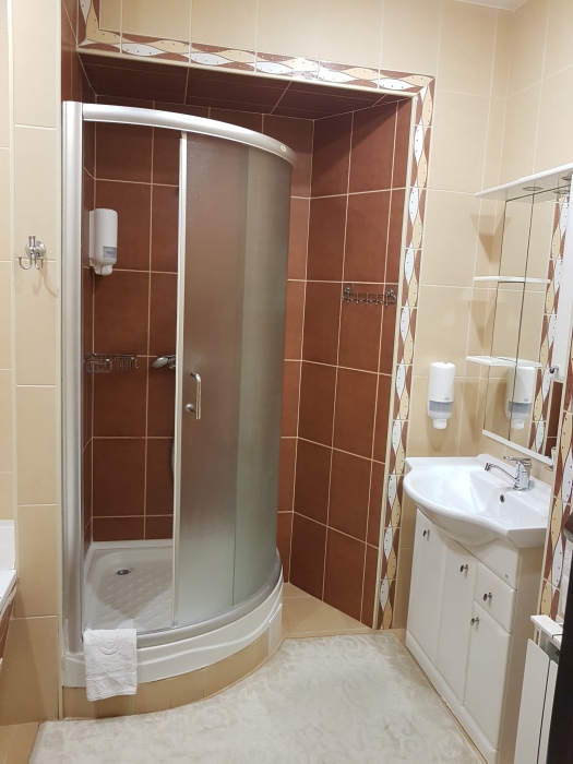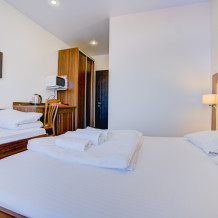 Площадь комнаты - 18 кв м. К вашим услугам: двуспальная кровать, односпальная кровать с ортопедическими матрасами, кондиционер, телевизор, холодильник, микроволновая печь, чайник, набор посуды, сейф, тапочки. Санузел с душевой кабинкой, фен, гигиенические наборы, мыло, гель, шампунь. На этаже расположена кухня общего пользования.