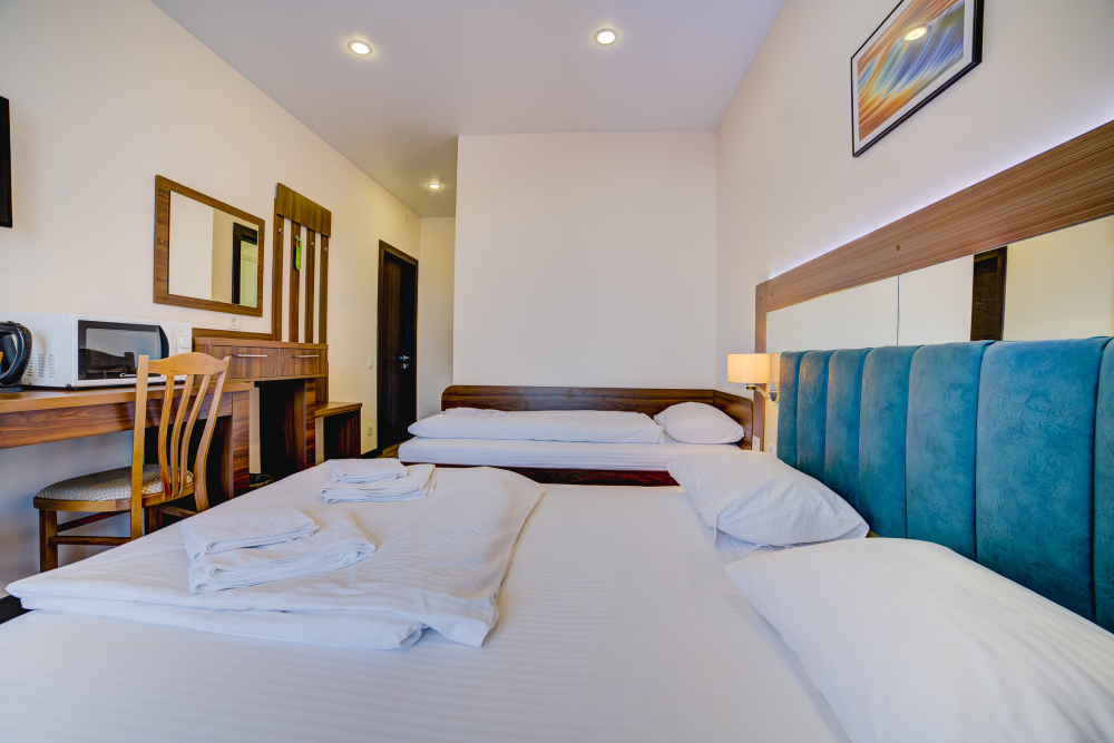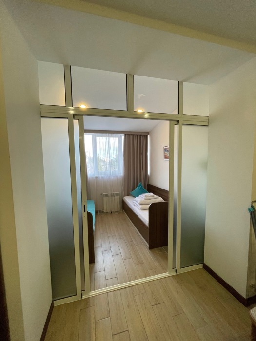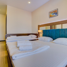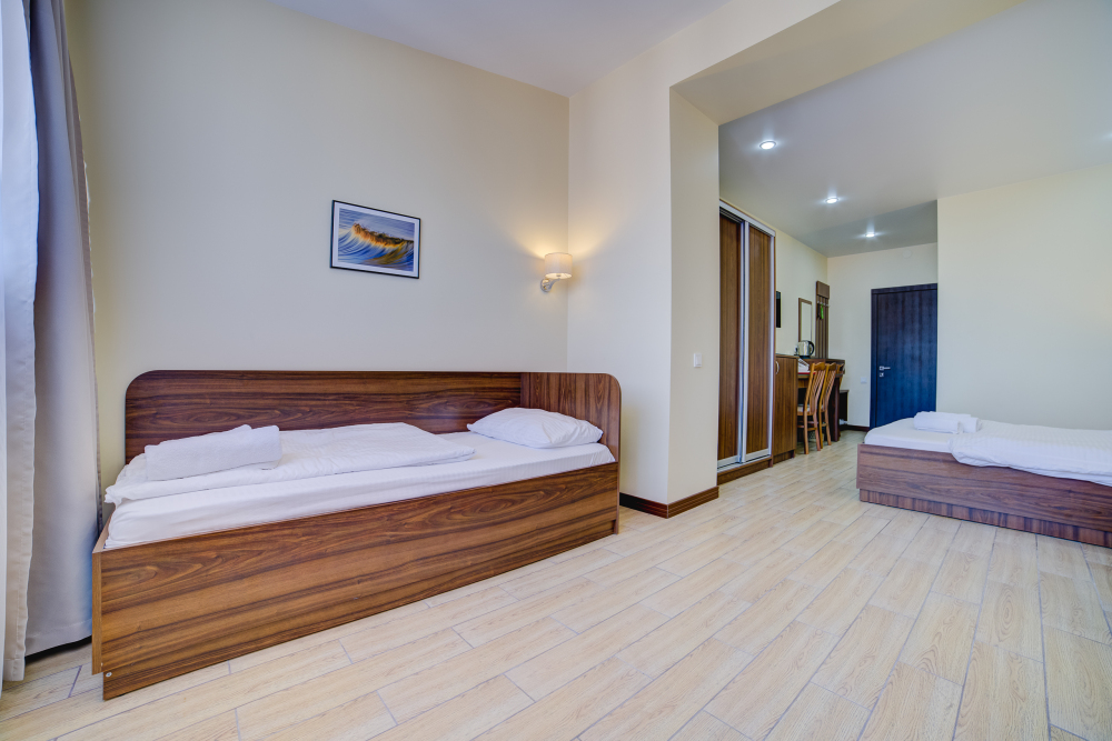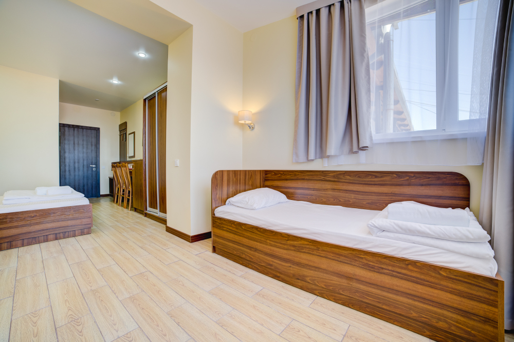 Площадь комнаты - 25 кв м. К вашим услугам: двуспальная кровать, две односпальные кровати с ортопедическими матрасами, кондиционер, телевизор, холодильник, микроволновая печь, чайник, набор посуды, сейф, тапочки. Санузел с душевой кабинкой, фен, гигиенические наборы, мыло, гель, шампунь. На этаже расположена кухня общего пользования.
