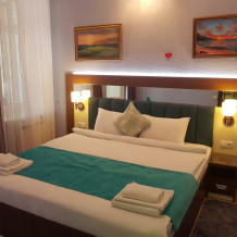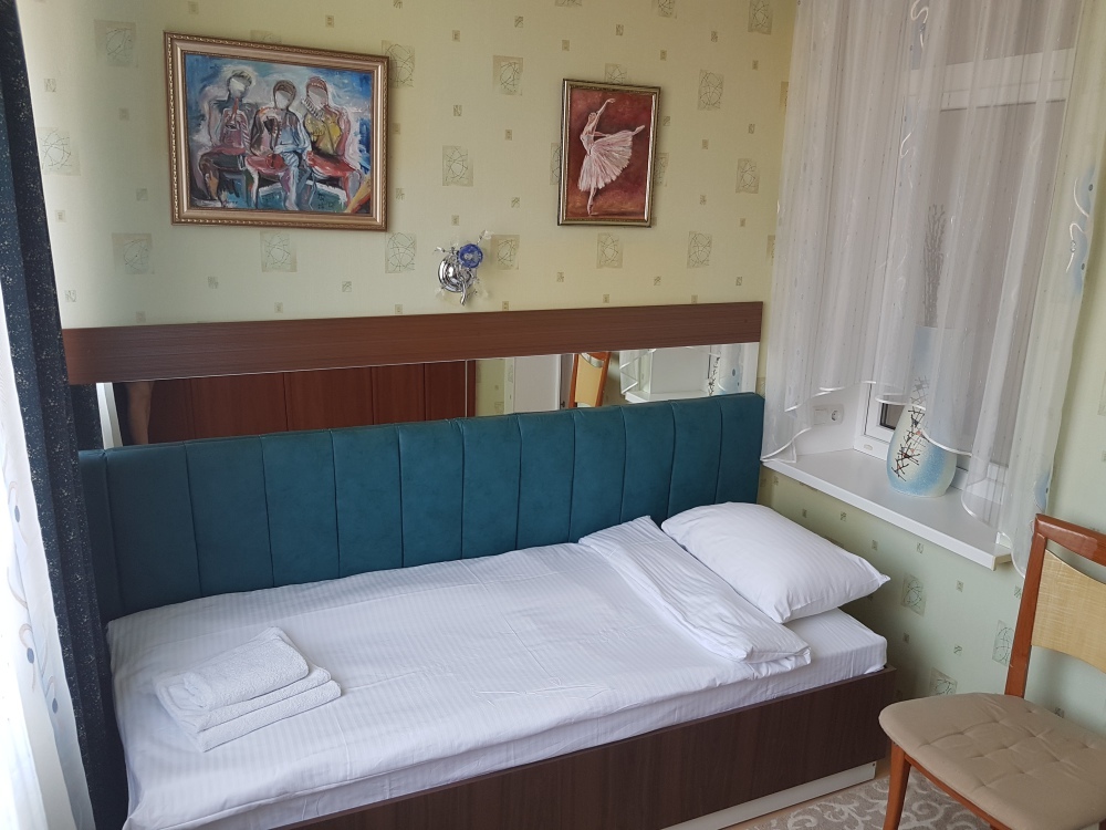 Площадь комнаты - 16 кв м. Двуспальная кровать, телевизор, холодильник, набор посуды, тапочки, туалетные средства, банные полотенца, кондиционер, автономное отопление (зимой), санузел с душевой кабинкой, французский балкон (вид на город), WI-FI. Уборка – ежедневно, смена постельного белья – раз в три дня.