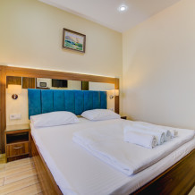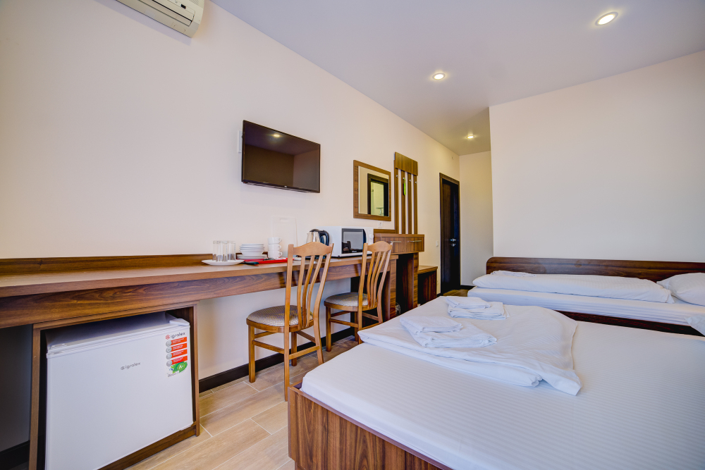 Площадь комнаты - 16 кв м. К вашим услугам: двуспальная кровать, односпальная кровать с ортопедическими матрасами, кондиционер, телевизор, холодильник, микроволновая печь, чайник, набор посуды, сейф, тапочки. Санузел с душевой кабинкой, фен, гигиенические наборы, мыло, гель, шампунь. На этаже расположена кухня общего пользования.