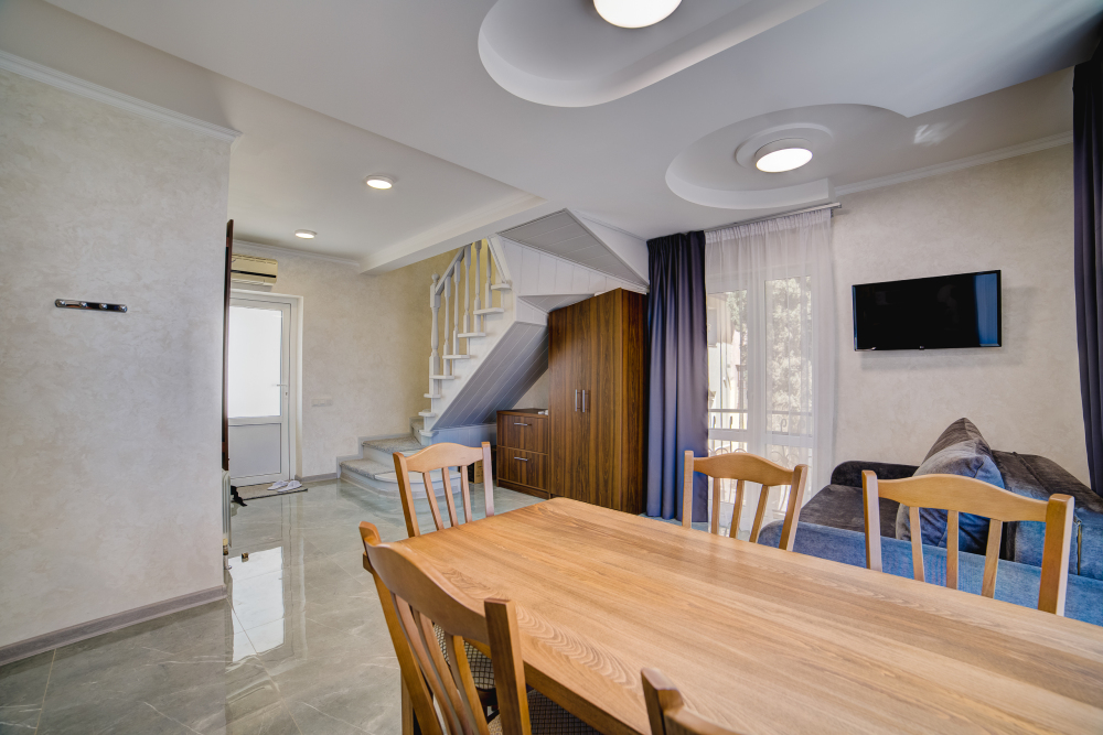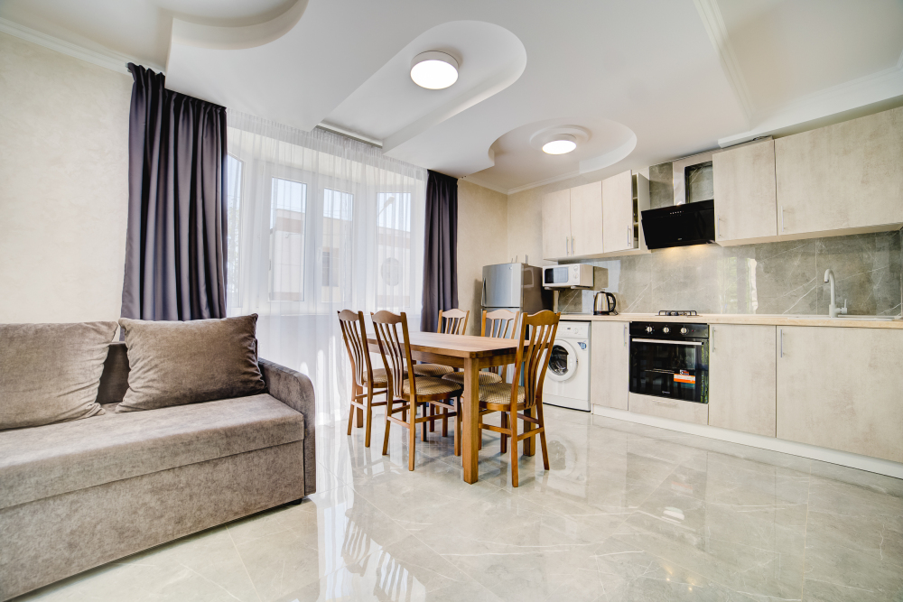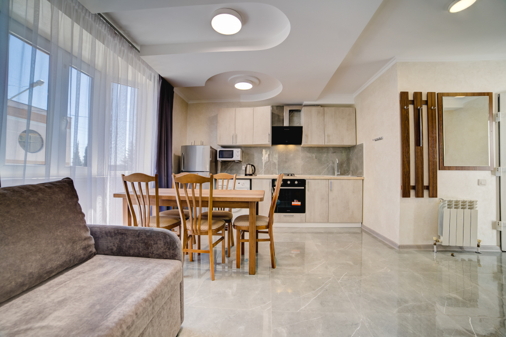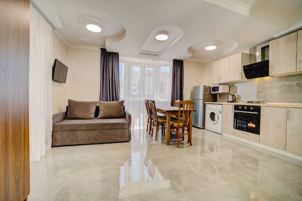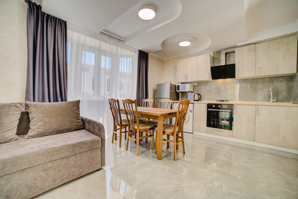 Площадь - 75 кв м: 4 комнаты на 1 этаже дома. Односпальная кровать, 2 двуспальных кровати, раскладной двуспальный диван, бытовая техника, газовая плита, набор посуды, тапочки, туалетные средства, банные полотенца, кондиционер, Wi-Fi, санузел с душевой кабинкой и ванной. Вид на город. Уборка – ежедневно, смена постельного белья – раз в пять дней.