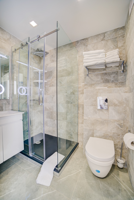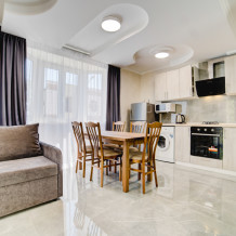 Площадь комнаты – 25 кв м. К вашим услугам: двухспальная кровать, две односпальных кровати с ортопедическими матрасами, оборудованная кухня с посудой и электрической плитой, стиральная машина, холодильник, чайник, микроволновая печь, кондиционер, сейф, телевизор, тапочки. Санузел с душевой кабинкой, фен, гигиенические наборы, мыло, гель, шампунь. На этаже расположена кухня общего пользования.