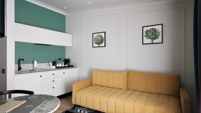 Номер категории Делюкс с кухней – это комфорт и стиль в сочетании с классическим интерьером. Просторный номер располагает большими удобными кроватями с ортопедическим матрасом и гипоаллергенным постельным бельем, кухонной зоной с варочной панелью и необходимой посудой, ванной, современным техническим оснащением, шторами Блэк-аут.