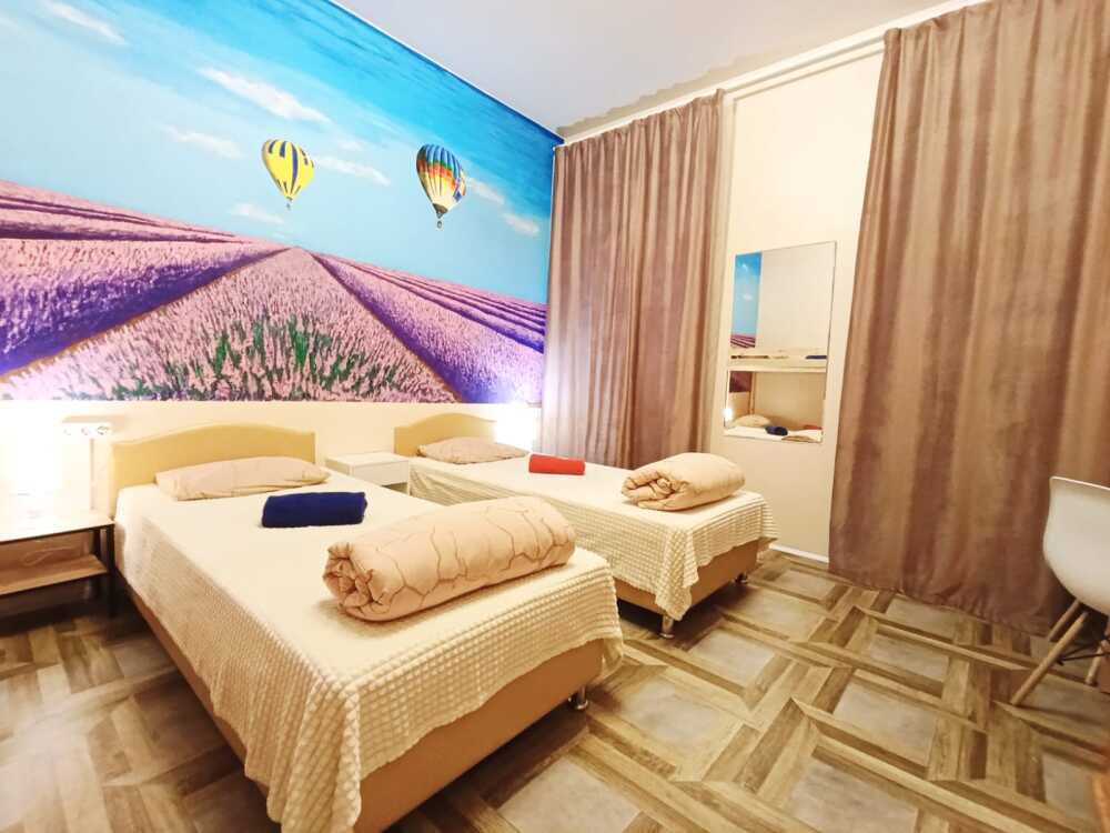 Оснащение комнаты: 2 односпальные кровати, шкаф для вещей, зеркало, прикроватные тумбочки, светильник, стол и стул, мини-холодильник.