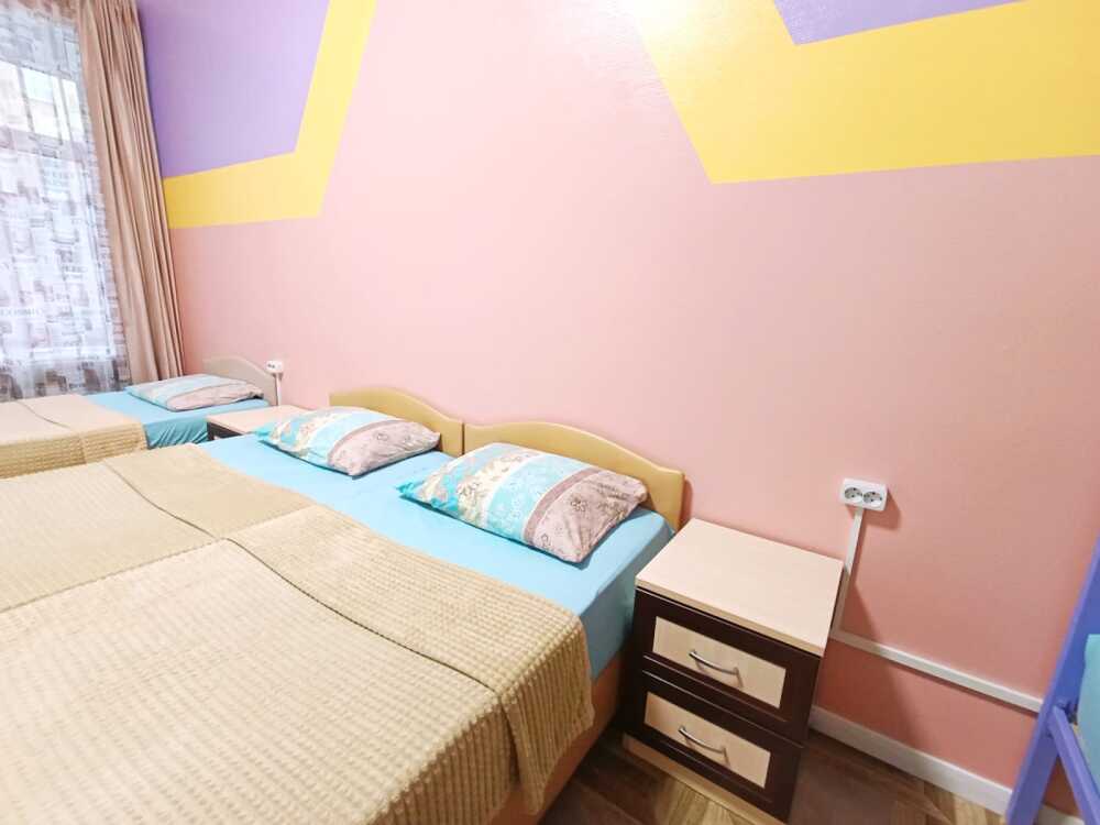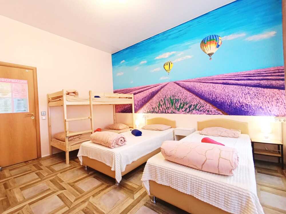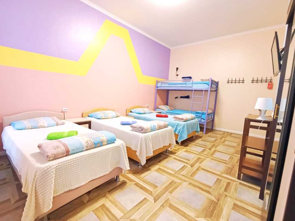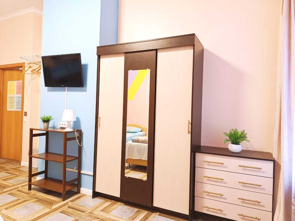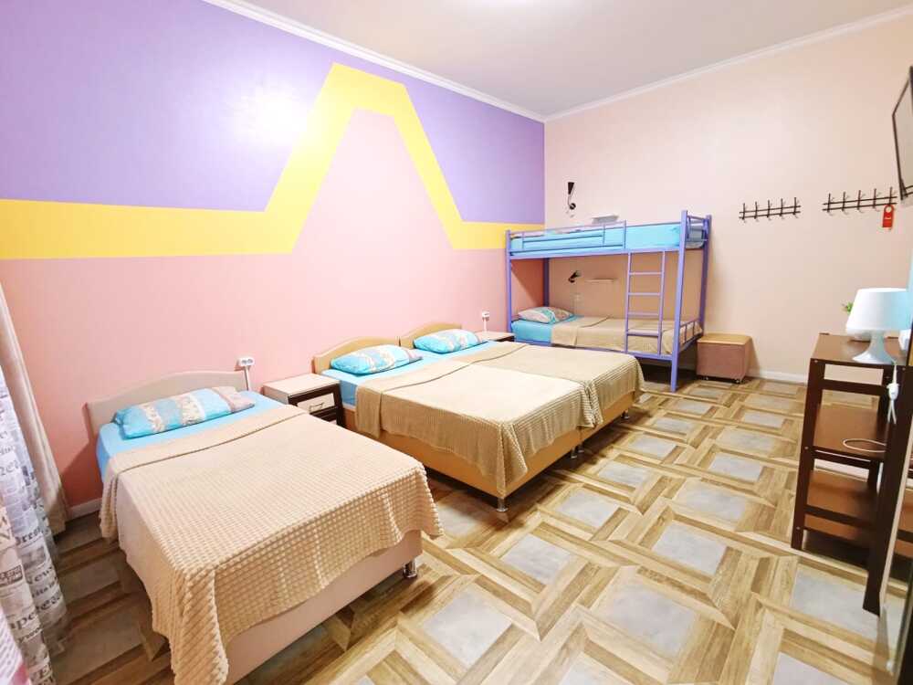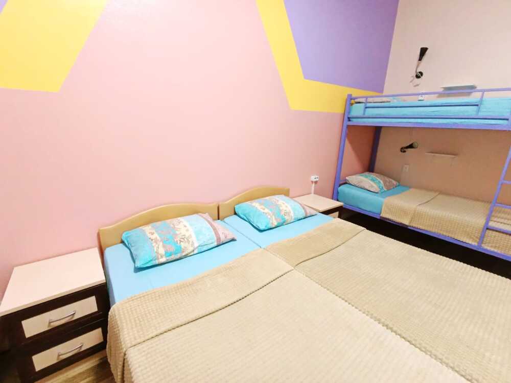 Оснащение: 2 раздельные деревянные кровати, размером 90х200 см с ортопедическим основанием, 1 двухъярусная деревянная кровать, прикроватные тумбы, стол, стулья, комод, гардеробная система, настенная вешалка для вещей, холодильник.