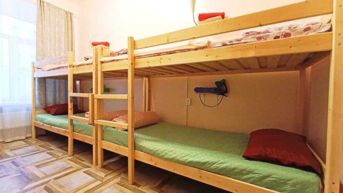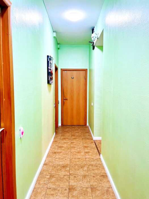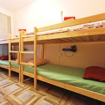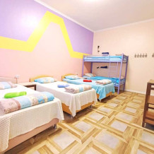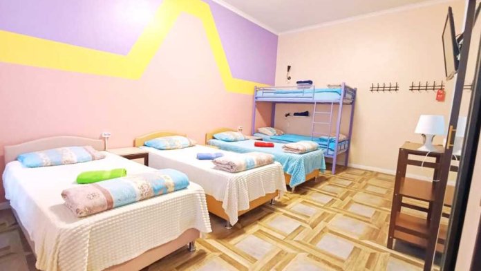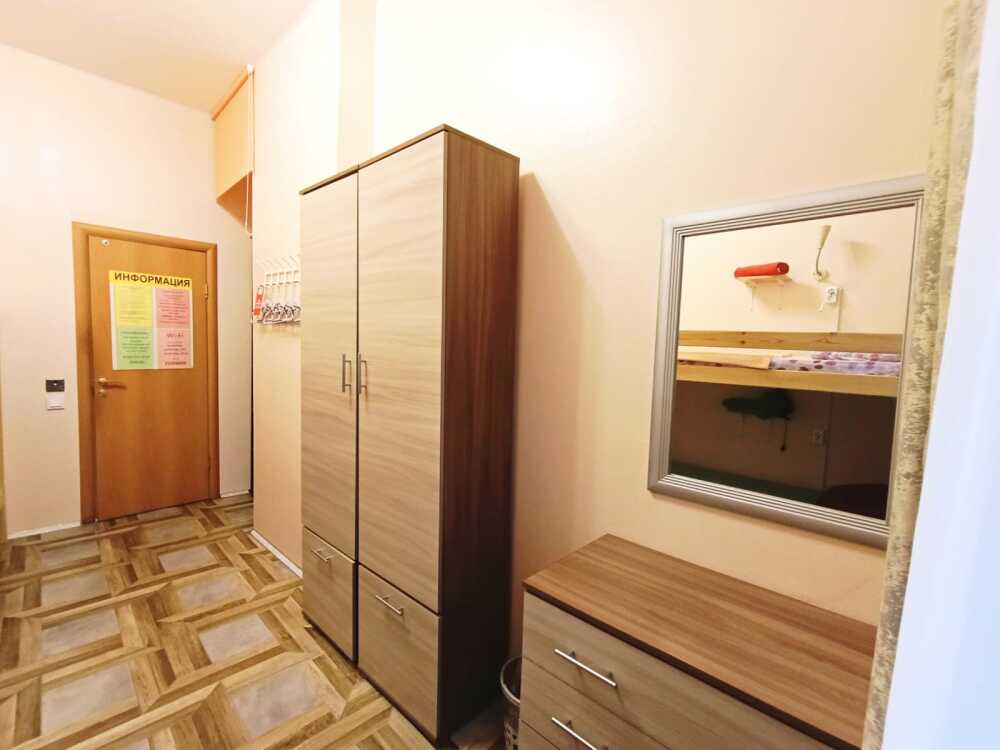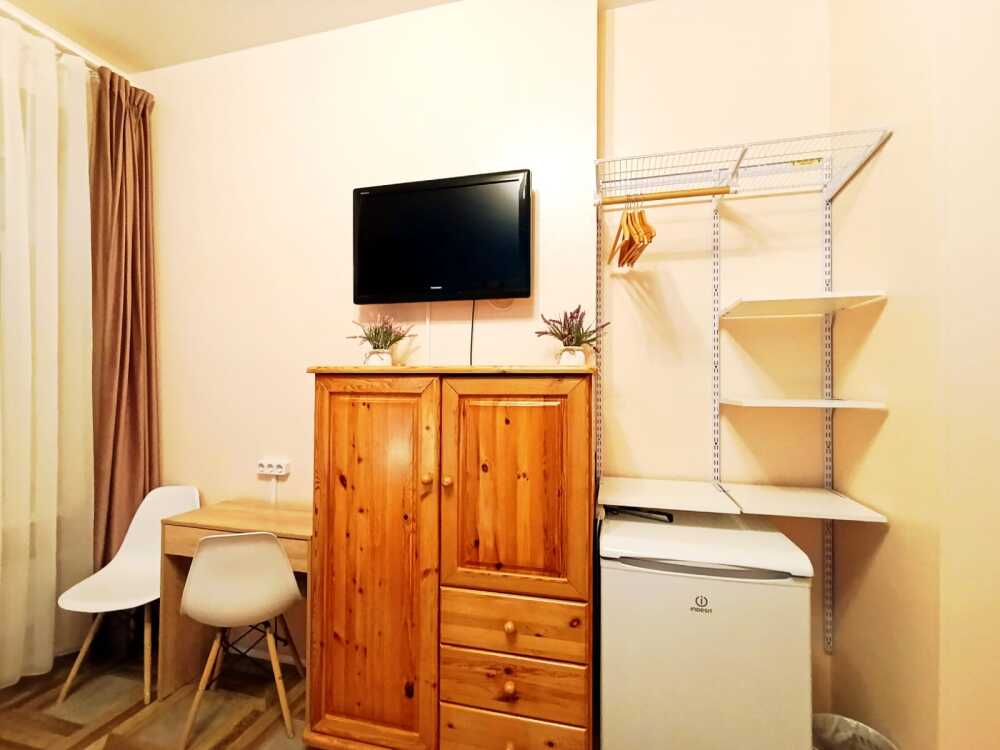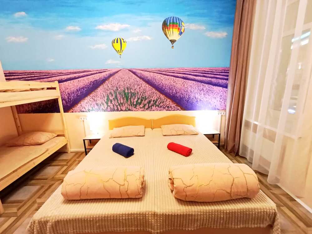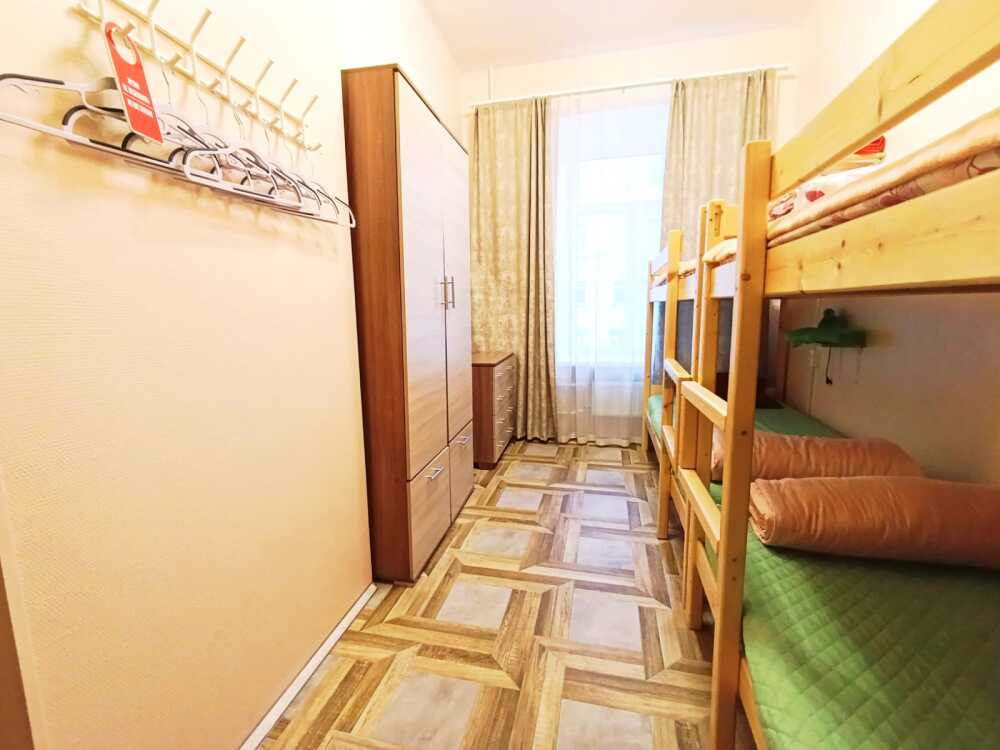 Оснащение: 2 раздельные деревянные кровати, размером 90х200 см с ортопедическим основанием, 1 двухъярусная деревянная кровать, прикроватные тумбы, стол, стулья, комод, гардеробная система, настенная вешалка для вещей, холодильник.