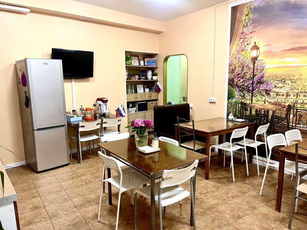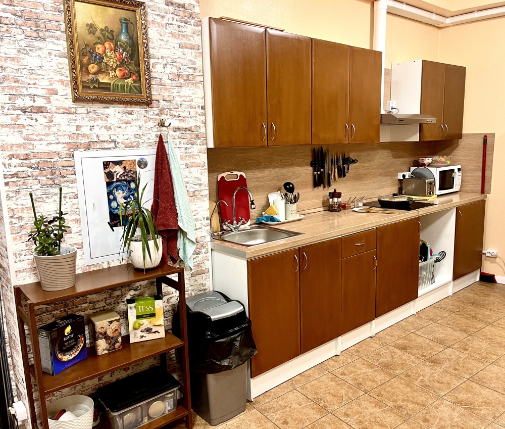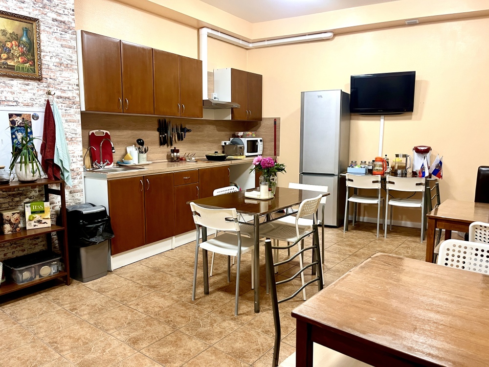 Большая общая кухня-гостиная полностью оборудованная для приготовления и принятия пищи. 3 общих санузла: 2 душевые совместно с туалетом и 1 туалет отдельно.
