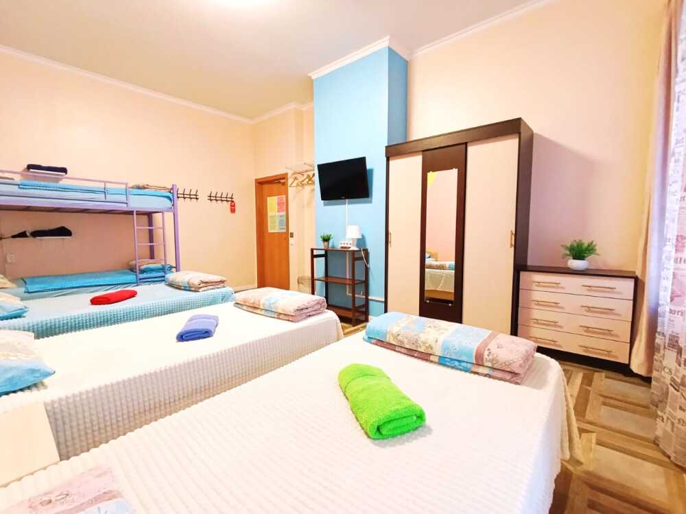 В комнате: 3 раздельные кровати размером 90х190. Ж/к телевизор, шкаф-купе, комод для вещей, зеркало, прикроватные тумбочки, светильник, столик журнальный, стулья. Пользование общими санузлами и душевыми.