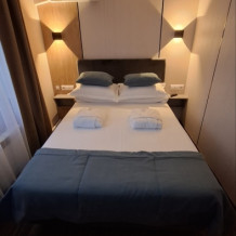 В номере имеется: 1 двуспальная кровать (140*200) с изголовьем, мини-прихожая, письменный, шкаф, стул, телевизор, телефон, мини холодильник с баром, чайник, фен, ванная комната с санузлом, халаты.