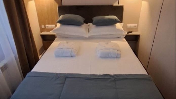 В номере имеется: 2 кровати (90*200, 140*200) с изголовьем, мини-прихожая, письменный стол, шкаф, стул, телевизор, телефон, мини холодильник с баром, чайник, фен, ванная комната с санузлом, халаты.