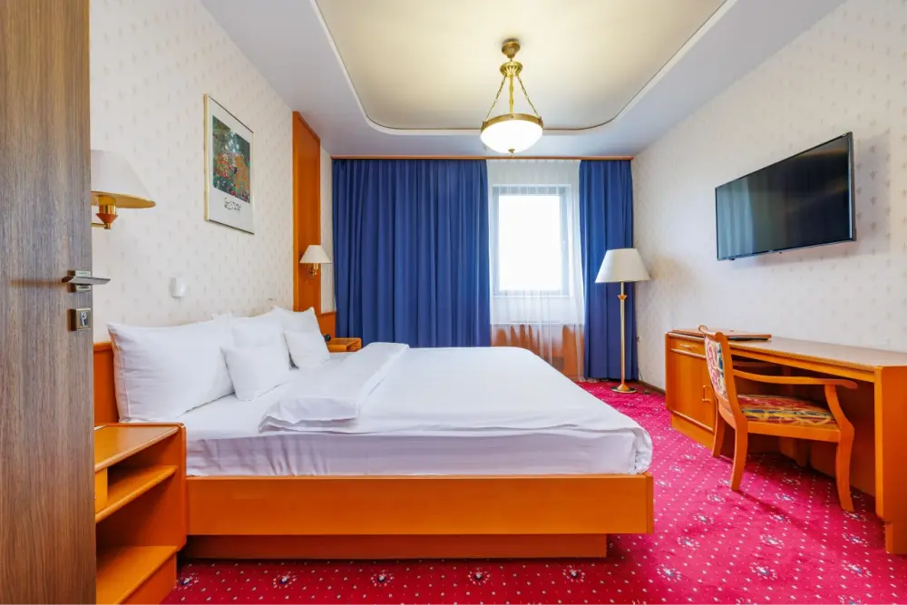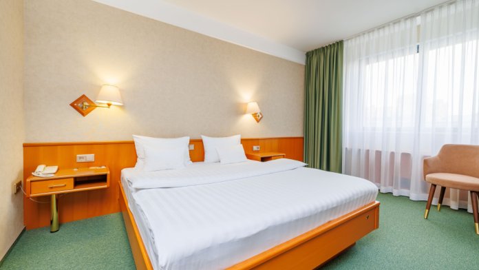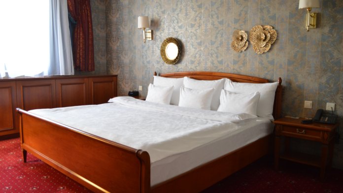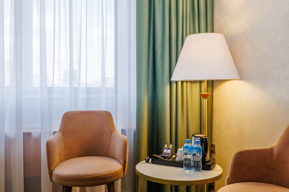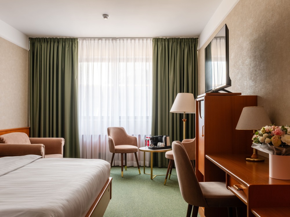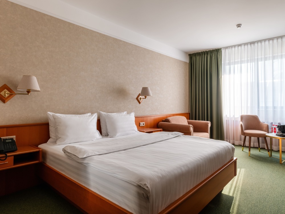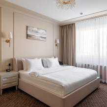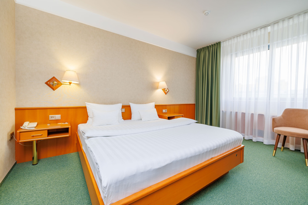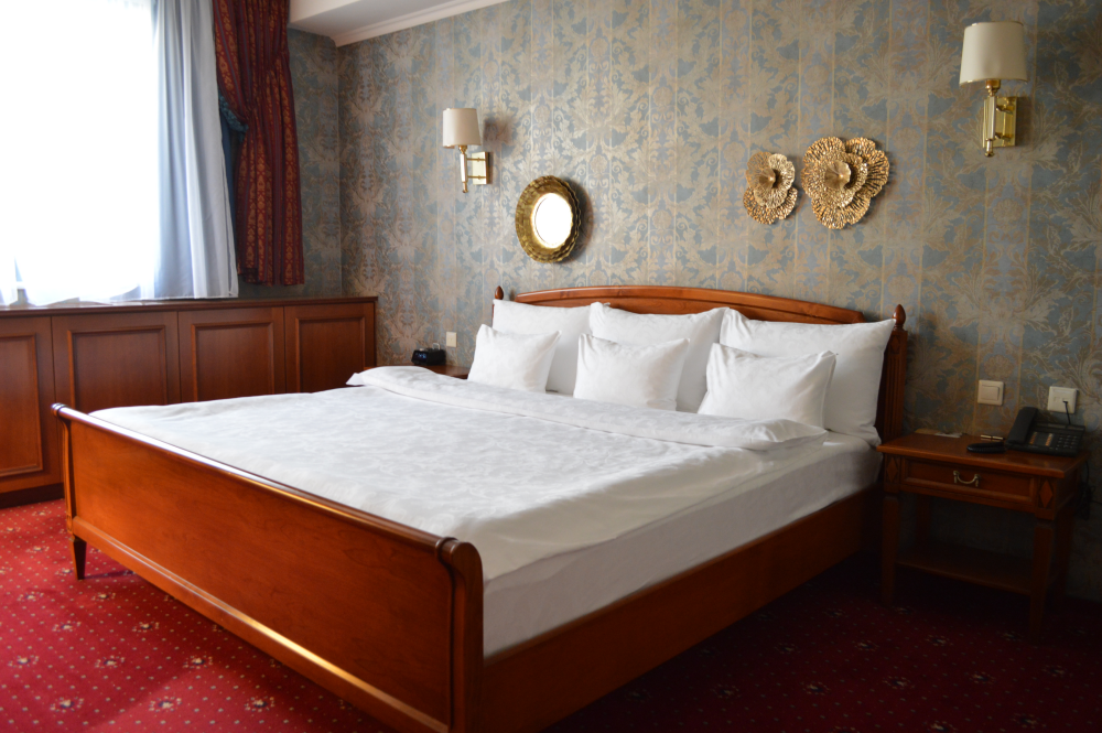 В номере: большая двуспальная кровать, собственная ванная комната, ж/к телевизор, телефон, сейф, гладильная станция, халат, комплект полотенец, гигиенический набор, фен, тапочки.