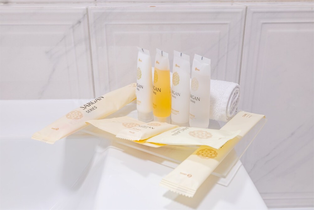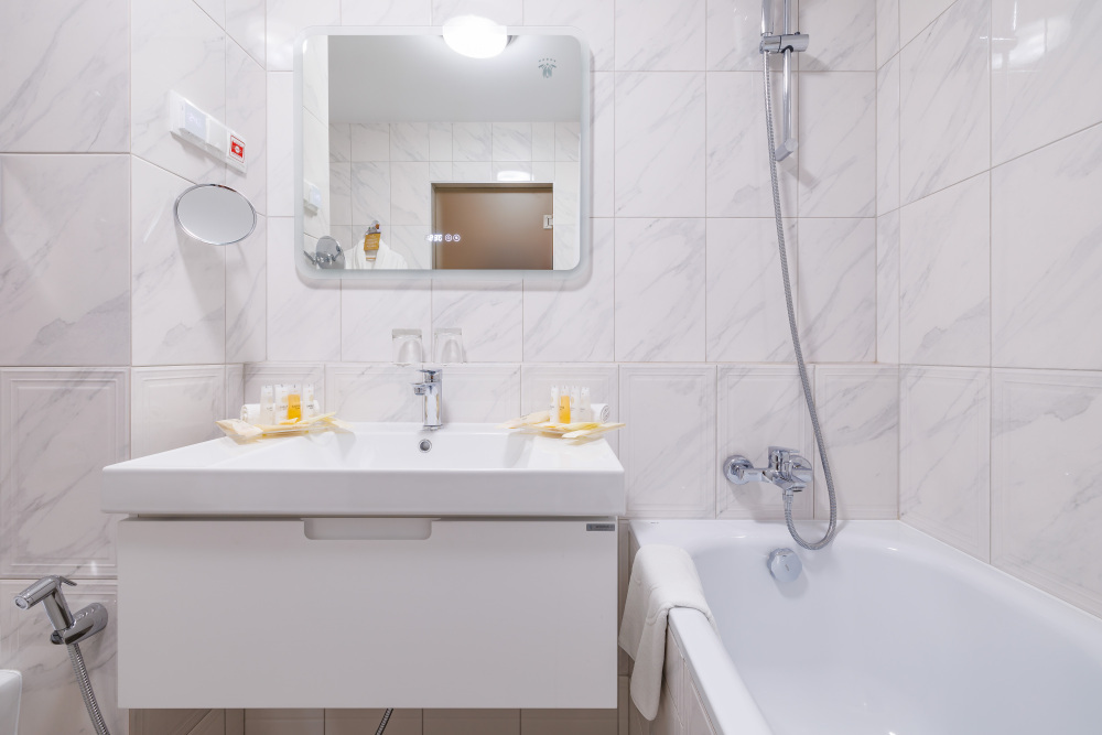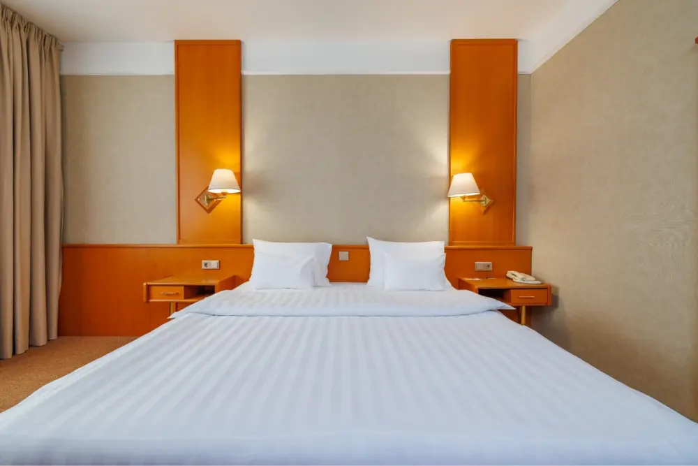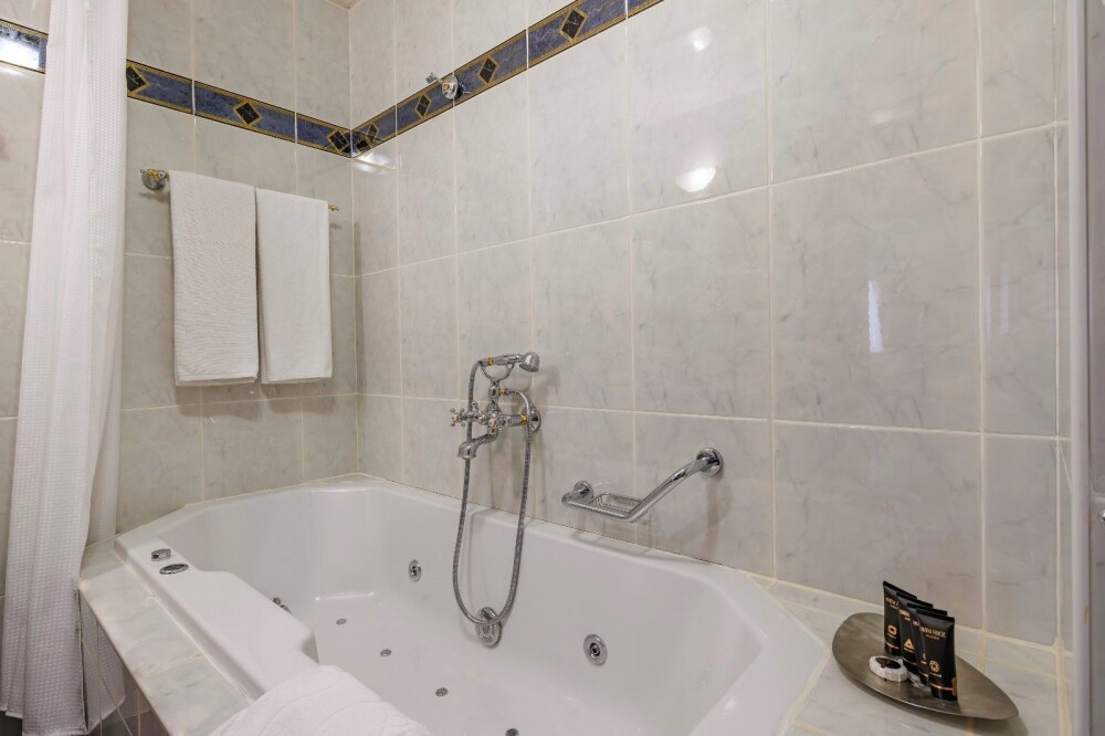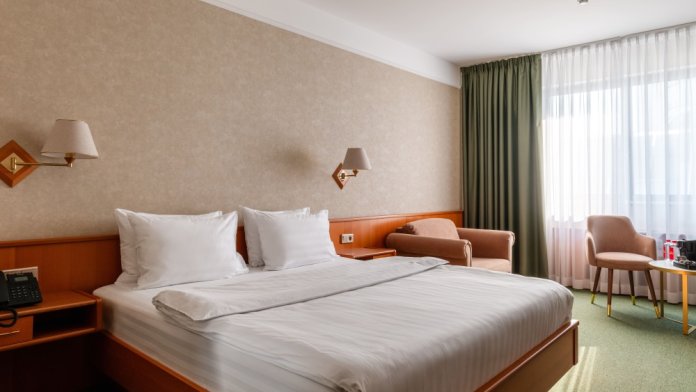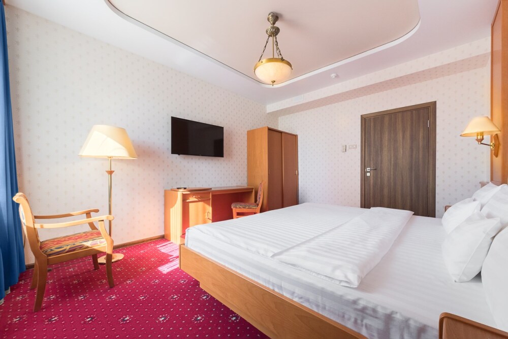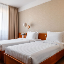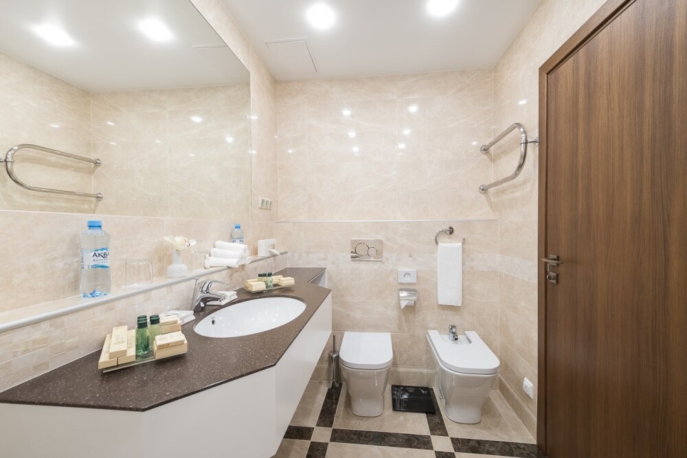 В номере: большая двуспальная кровать, собственная ванная комната, ж/к телевизор, телефон, сейф, гладильная станция, халат, комплект полотенец, гигиенический набор, фен, тапочки.
