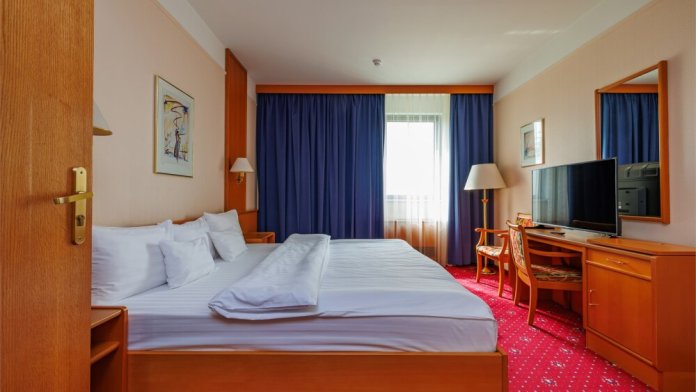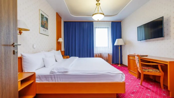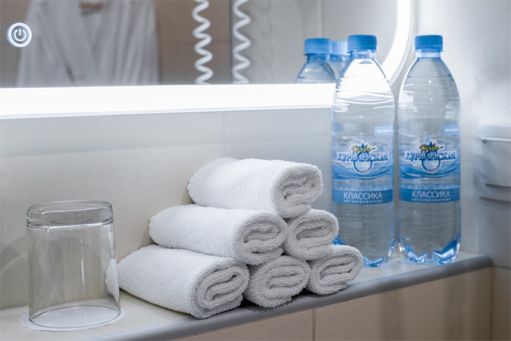 В номере: ж/к телевизор, мини-бар, телефон, сейф, халат, комплект полотенец, тапочки. Смена постельного белья каждый день.