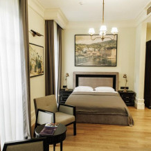 Номер с просторной ванной комнатой и комфортной спальней. Тихие и уютные номера оформлены в классическом стиле.