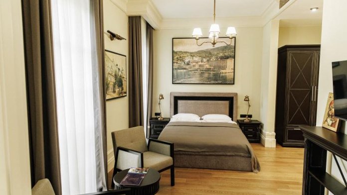 Неповторимая архитектура двух корпусов отеля: «Альфа» и «Омега» способствует погружению в историческую атмосферу. К услугам гостей отеля 73 комфортабельных номера, выполненных в современном стиле, различных категорий. Номера оснащены всем необходимым для приятного отдыха наших гостей: двухспальная кровать с эргономичным матрасом, махровый халат и тапочки, мини-бар, питьевая вода, LCD телевизор, система климат-контроля, чайная станция, сейф и фен.