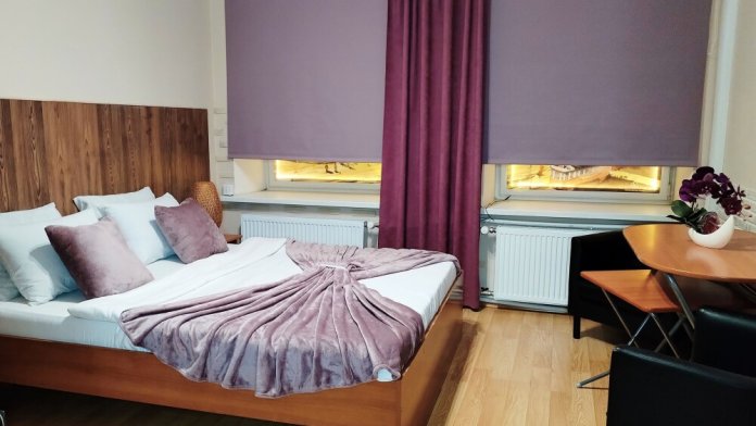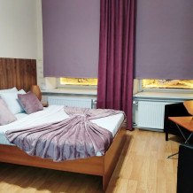 Просторная меблированная комната, размещением от 1 до 3 человек, оформленная в стиле лофт. Располагает собственной ванной комнатой и мини кухней. Проживание предполагает также пользование стиральной машиной, гладильными принадлежностями, фенами, расположенными в общей зоне.