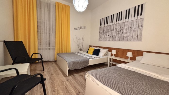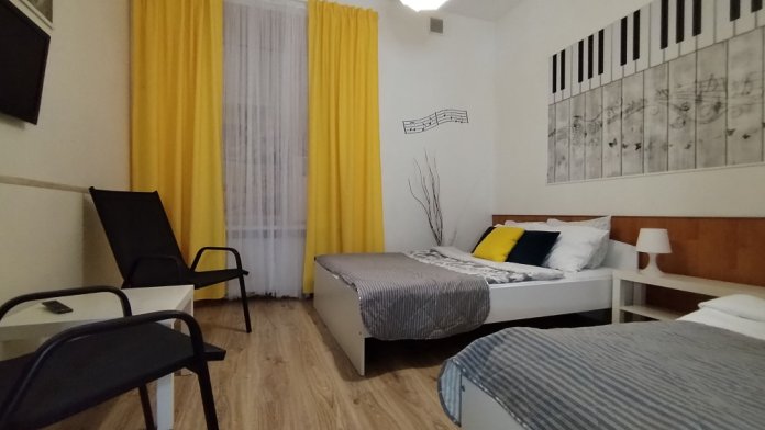 Просторная меблированная комната, размещением от 1 до 3 человек, оформленная в музыкальном стиле. Располагает собственной ванной комнатой и мини-кухней. Гости также могут пользоваться стиральной машиной, гладильными принадлежностями, фенами, аптечкой, которые находятся в общей зоне.