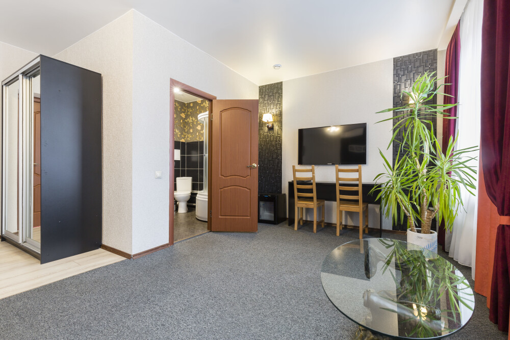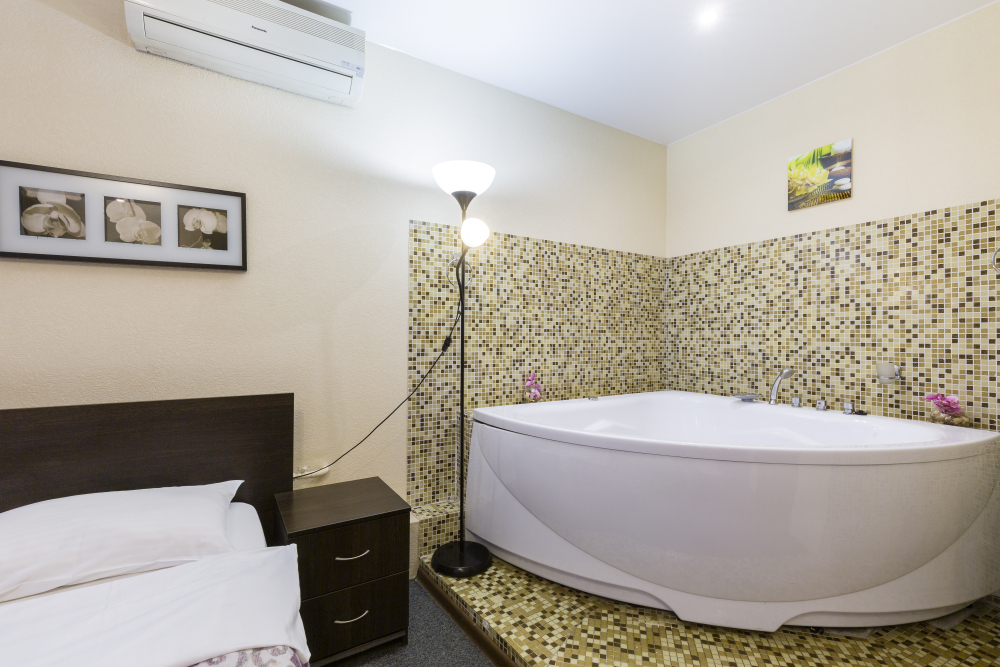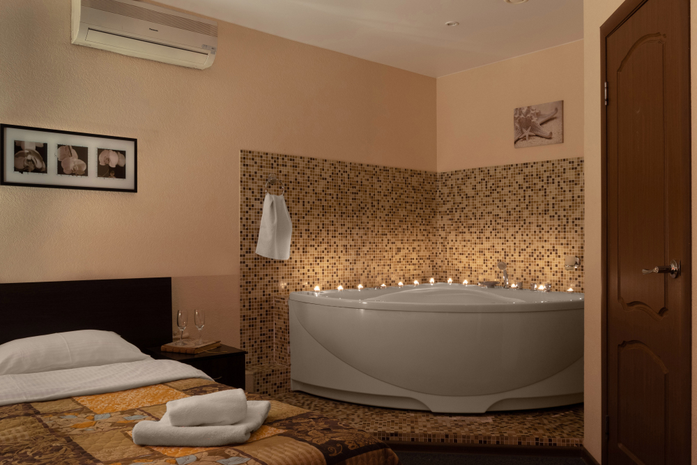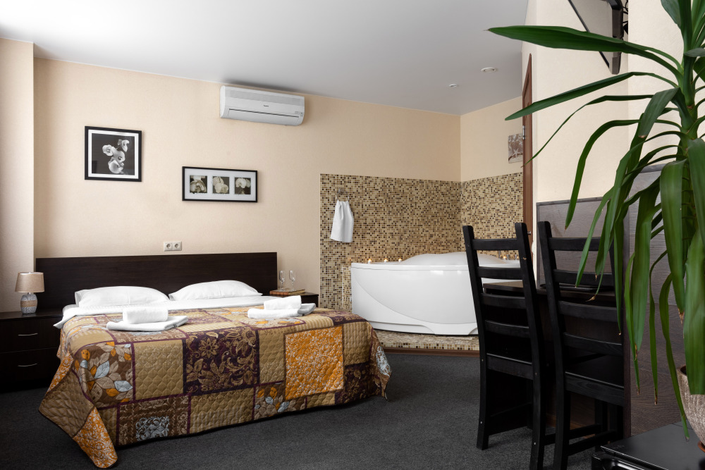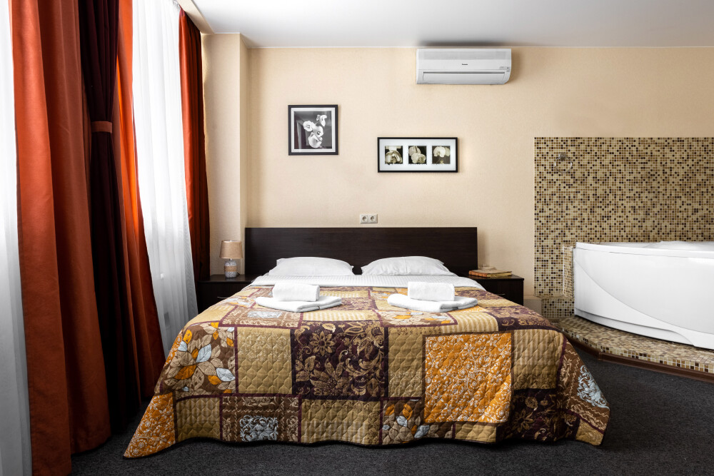 Просторный номер с удобной двуспальной кроватью, рядом с которой установлена гидромассажная ванна. Дополнительно в санузле есть душевая кабина.