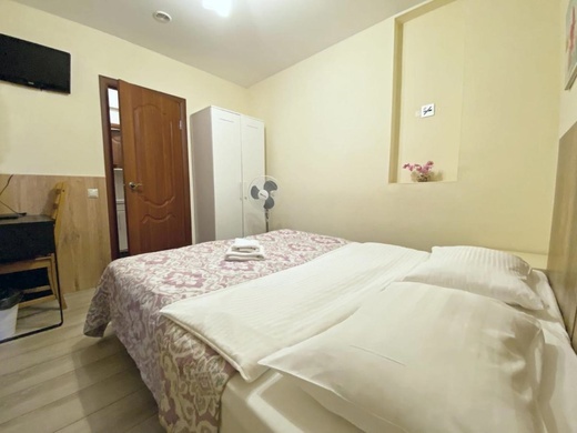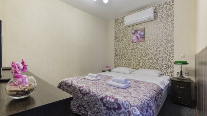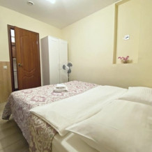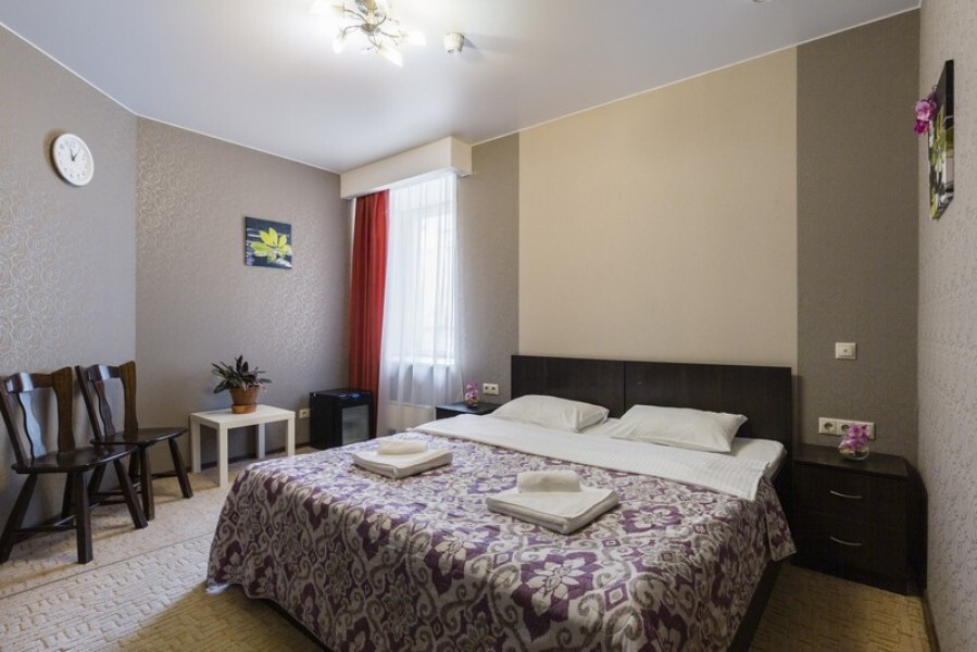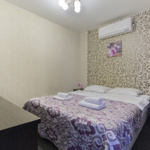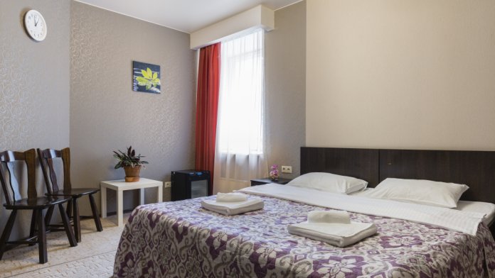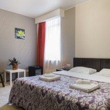 В номерах одна двуспальная и одна односпальная кровати, также возможна установка дополнительных мест - раскладушек