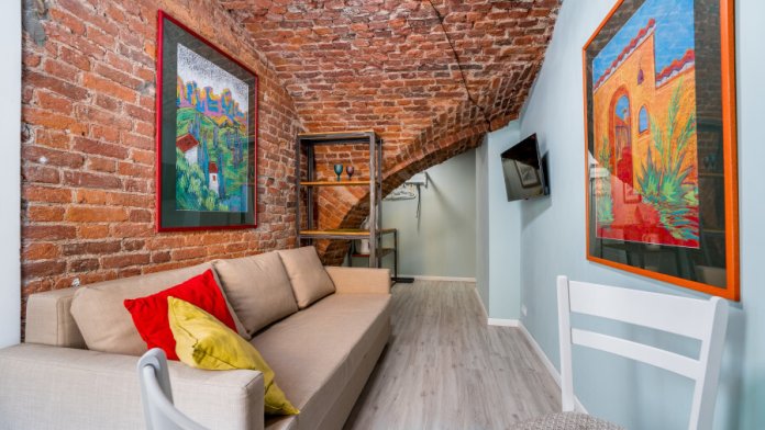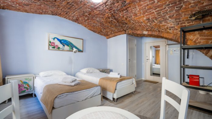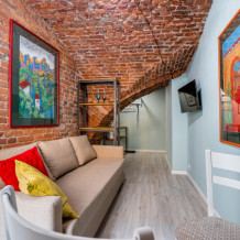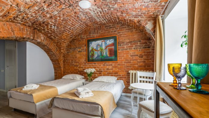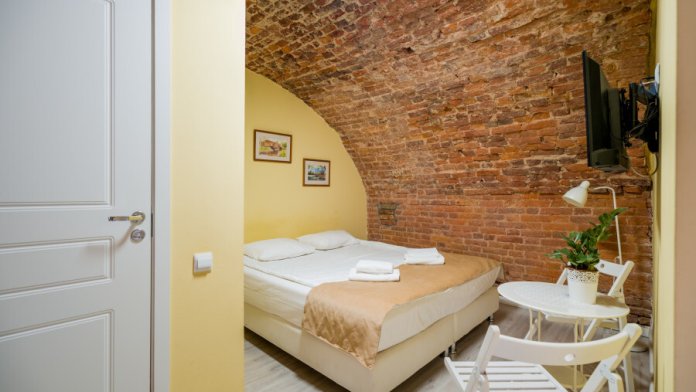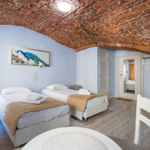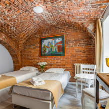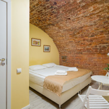 Единственный номер, где сохранилась полукруглая арка старинного помещения каретной при доме Адамини. На потолке - кирпичные своды, являющиеся объектом культурного наследия под охраной государства. Удобная ванная комната с душем, феном, тапочками и набором ванных принадлежностей.