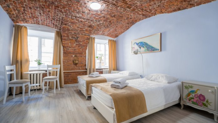Самый просторный двухкомнатный номер в мини-отеле. Большой, комфортабельный, раскладывающийся диван в одной комнате и односпальная кровать в другой (без двери между ними). Удобные матрасы, качественное белье. Ванная комната с набором косметических принадлежностей, феном и тапочками. Обогреватель, напольный кондиционер, электрочайник и набор посуды. Два окна в тихий двор.