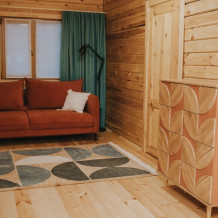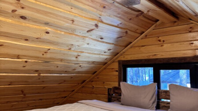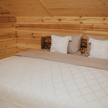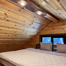 Удобства: Кухня оборудована посудой, приборами и бокалами; Спальня имеет комфортабельную большую кровать с натуральным постельным бельем из льна и хлопка; Туалетная и душевая комнаты оснащены всем необходимым, включая индивидуальные косметические наборы и полотенца; Терраса с мебелью и шезлонгами позволяет наслаждаться свежим воздухом и природой; Наличие русской бани на дровах - отличный способ расслабиться и отдохнуть; Ароматный и горячий чан даст возможность окунуться в атмосферу романтики и наслаждения видами леса.
