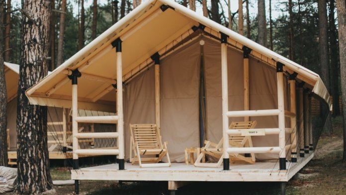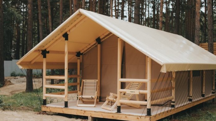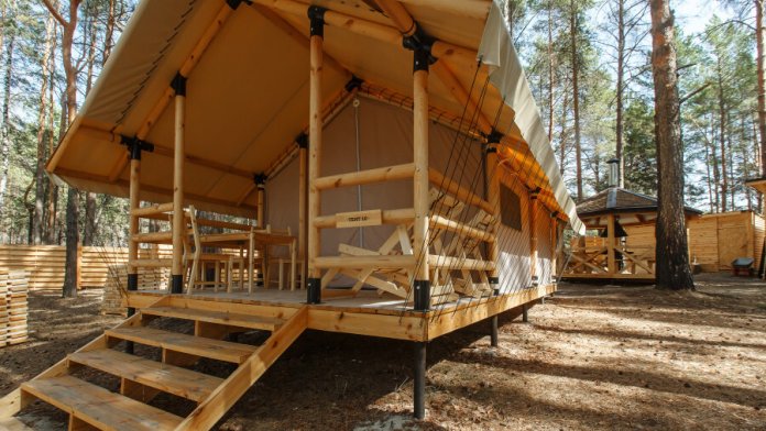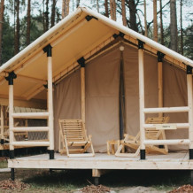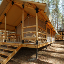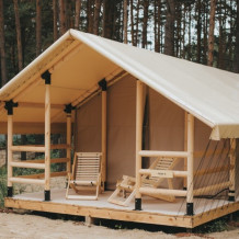 Тент рассчитан на максимальное размещение 4 человек, включая ребенка до 3 лет без дополнительного спального места. Обеденная и лаунж зона с шезлонгами на террасе, кухонная зона в тент-хаусе и общая гриль-беседка с дымоуловителями и искрогасителями так же оборудована шампурами и решеткой. Кухонная зона оснащена: холодильником, чайной станцией, посудой и столовыми приборами по количеству человек, что позволяет приготовить простые блюда.