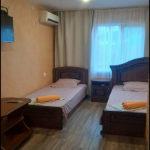 В номере: 1 двуспальная кровать, 2 односпальные кровати. Имеется телевизор, кондиционер, шкаф, вешалка, журнальный столик, холодильник, стулья.