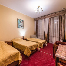 Просторный семейный номер с отельной прихожей и шкафом-купе для вещей, большой ванной комнатой, в которой банные полотенца, фен, гель для душа, мыло для рук, раковина, туалет, большая душевая. В номере холодильник, ЖК телевизор, кондиционер, кровати , кресло, стол, стул, прикроватные тумбочки со светильниками, ковролин.