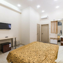 Есть номер с двухспальной кроватью и ванной, есть 2 раздельные кровати с балконом, есть две двуспальные кровати. Все студии с кондиционером.