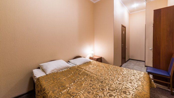 Одноместный стандартный номер, со всеми удобствами, душ, туалет, полотенца, гель для душа, тапочки. В номере шкаф для одежды, стол, стул, прикроватная тумбочка со светильником, ковролин.