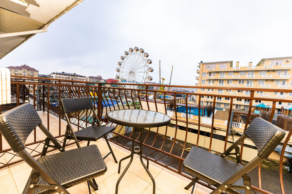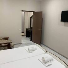 Просторный двухкомнатный номер с двуспальной кроватью, двухместным раскладным диваном, креслом кроватью и балконом.