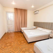 Уютный однокомнатный номер с двуспальной и двумя односпальными кроватями и балконом.
