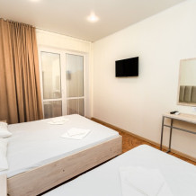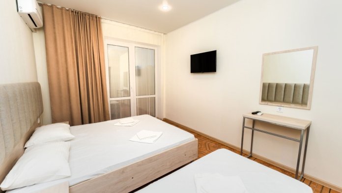 Уютный однокомнатный номер с двуспальной и односпальной кроватями и балконом.