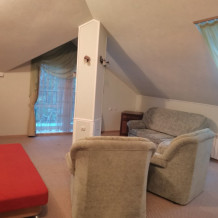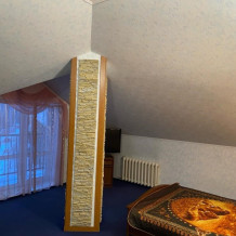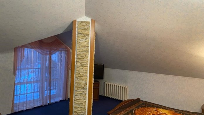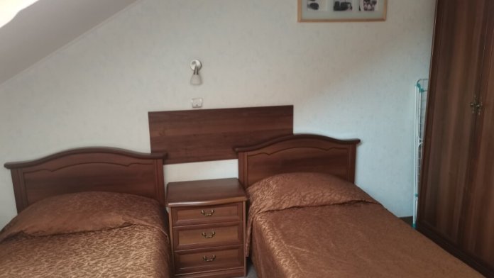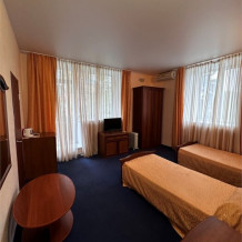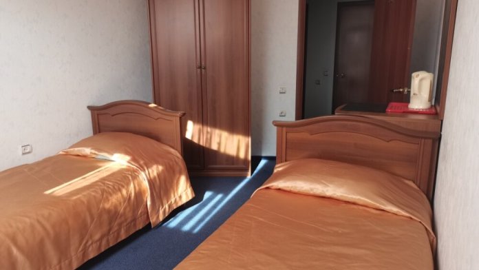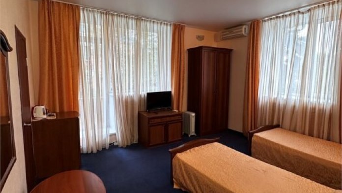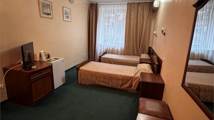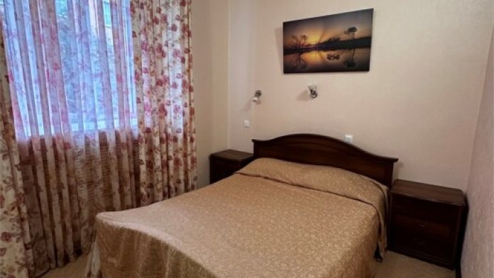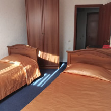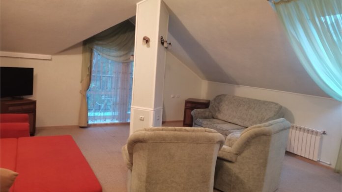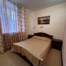 Двухкомнатный номер с кухней (с небольшой барной стойкой, с плитой, микроволновкой, холодильник, чайник, посуда и столовые приборы), двухспальная кровать, два дивана раскладывающихся, два раскладывающихся кресла-кровать. В каждой комнате и на кухне имеются теплые электрополы, установлен кондиционер, лоджия, ванная комната (душевая , санузел, стиральная машина).