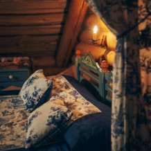 Однокомнатный номер с индивидуальным дизайном в стиле лофт и мебелью ручной работы в деревянном доме в стиле времен А.П.Чехова. В номере - двуспальная кровать, две тумбочки, два стула, холодильник, телевизор, электрочайник, фен, тапочки, халаты. Ванная комната с ванной и туалетом.