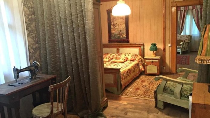 Однокомнатный номер с индивидуальным дизайном и мебелью ручной работы в деревянном доме в стиле времен А.П.Чехова. В номере - две раздельные кровати, две тумбочки, два стула, диван, холодильник, телевизор, электрочайник, фен, тапочки. Ванная комната с душем и туалетом.