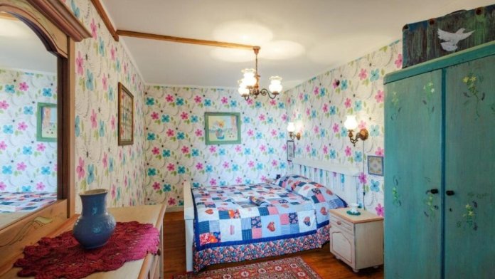 Однокомнатный номер с индивидуальным дизайном и мебелью ручной работы в деревянном доме в стиле времен А.П.Чехова. В номере - две раздельные кровати, две тумбочки, два стула, стол, комод, холодильник, телевизор, электрочайник, фен, тапочки. Ванная комната с душем и туалетом.