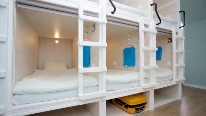 Личная капсула с разъемом для зарядных устройств, закрывающейся шторкой. В комнатах есть место для хранения чемоданов и личных вещей.